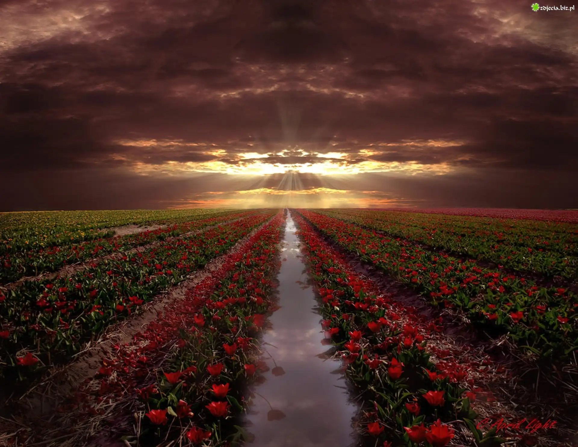 Zdjęcie Zachód Słońca, Promienie, Pole, Tulipany