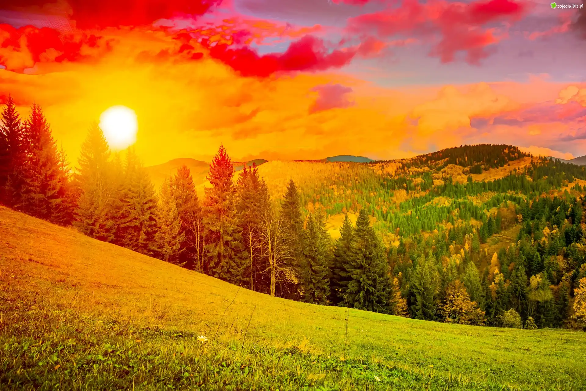 Zdjęcie Zachód, Słońce, Drzewa, Pomarańczowy, Kolor