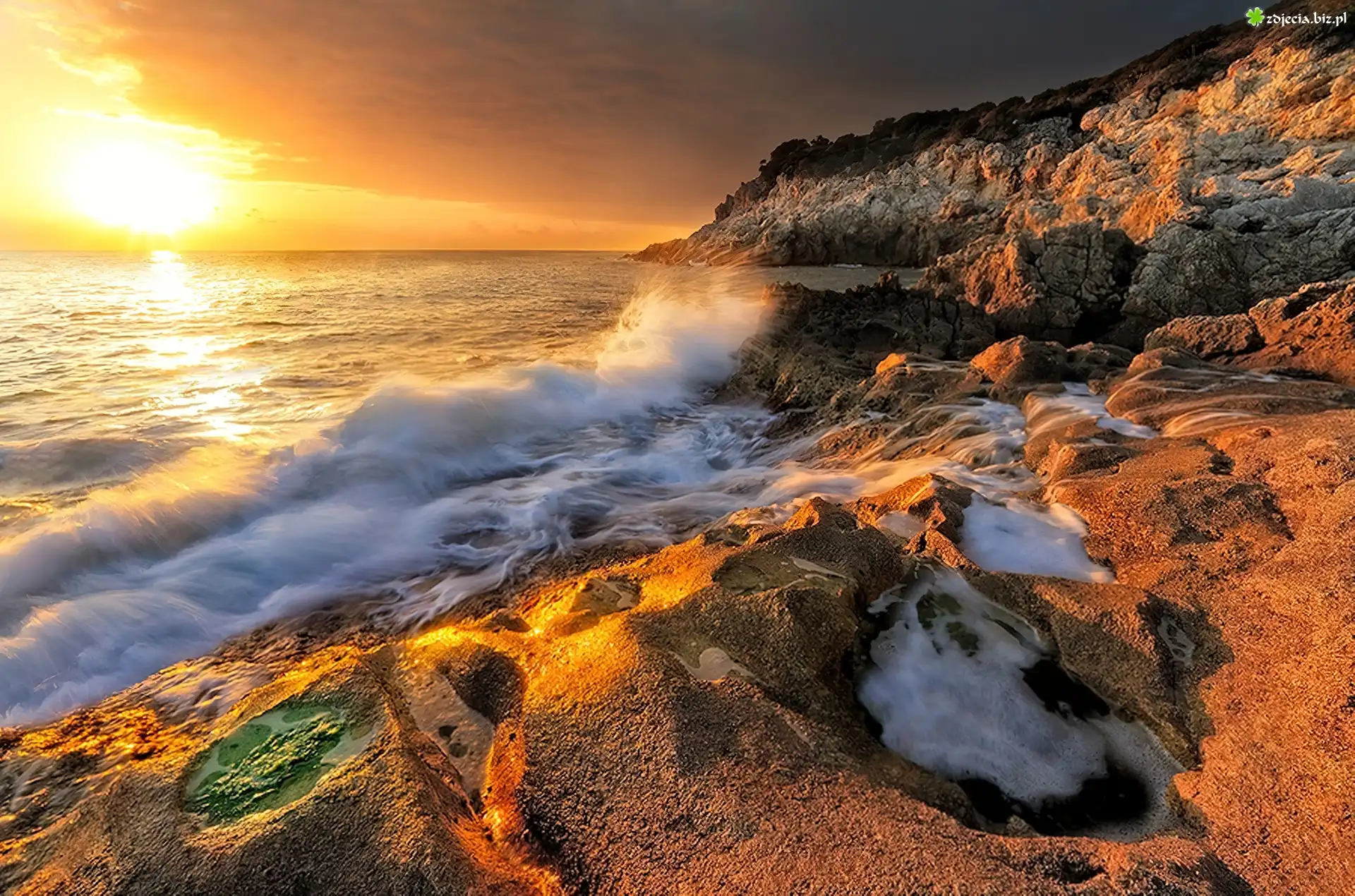 Zdjęcie Zachód, Słońca, Morze, Skały, Fale