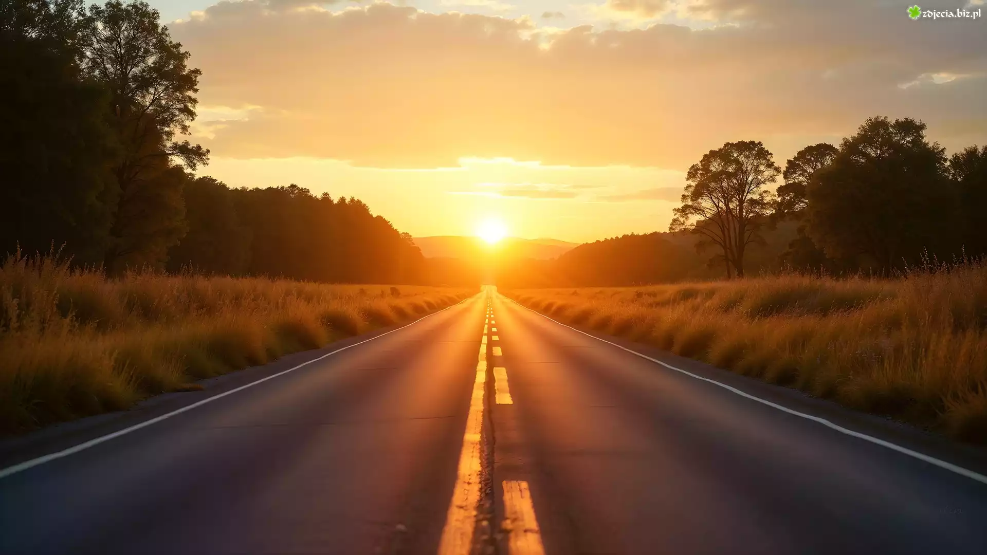 Zdjęcie, Droga, Zachód słońca, Drzewa, AI