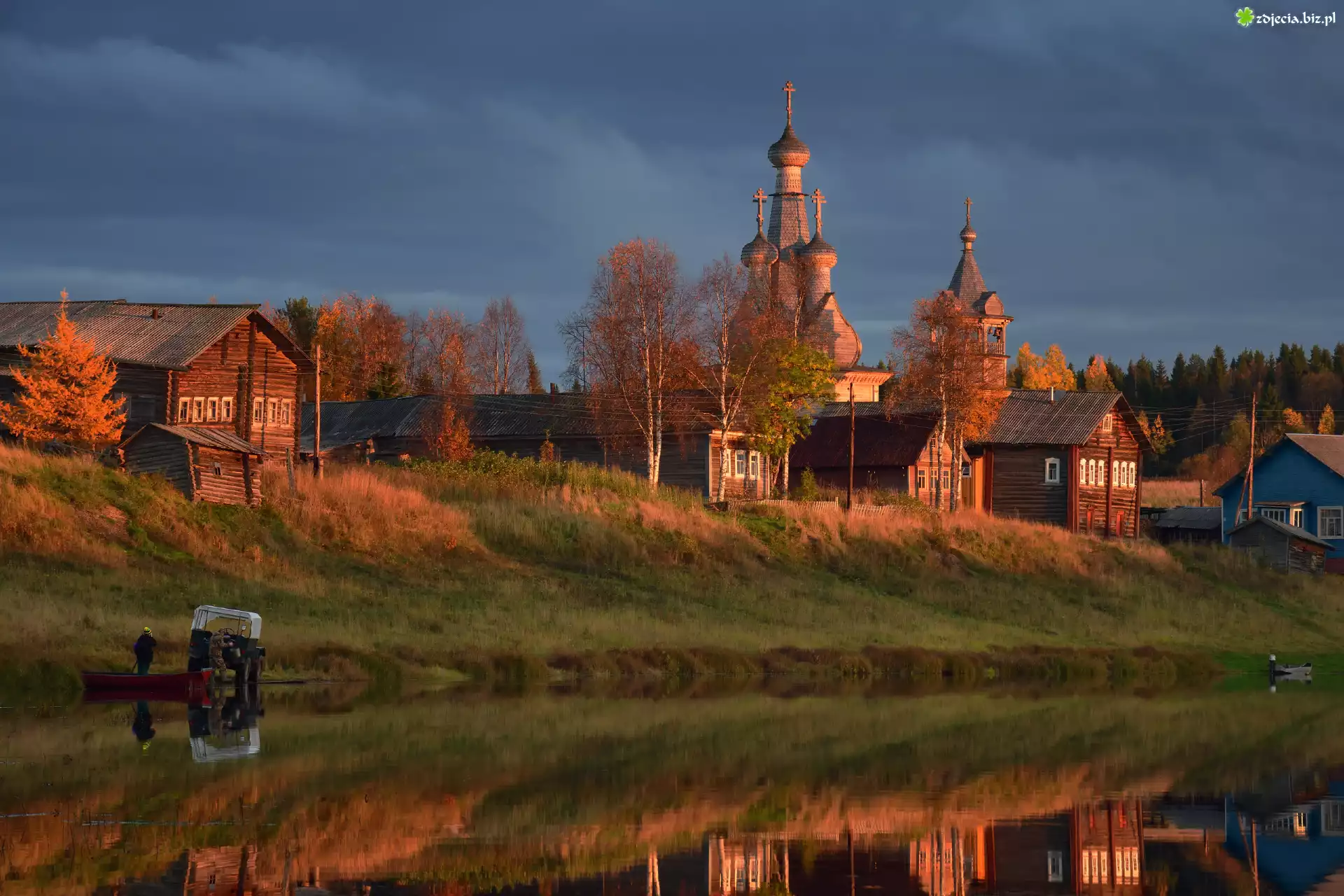 Zdjęcie Rosja, Obwód archangielski, Jesień, Wieś, Kimzha, Zachód słońca, Drzewa, Domy, Cerkiew