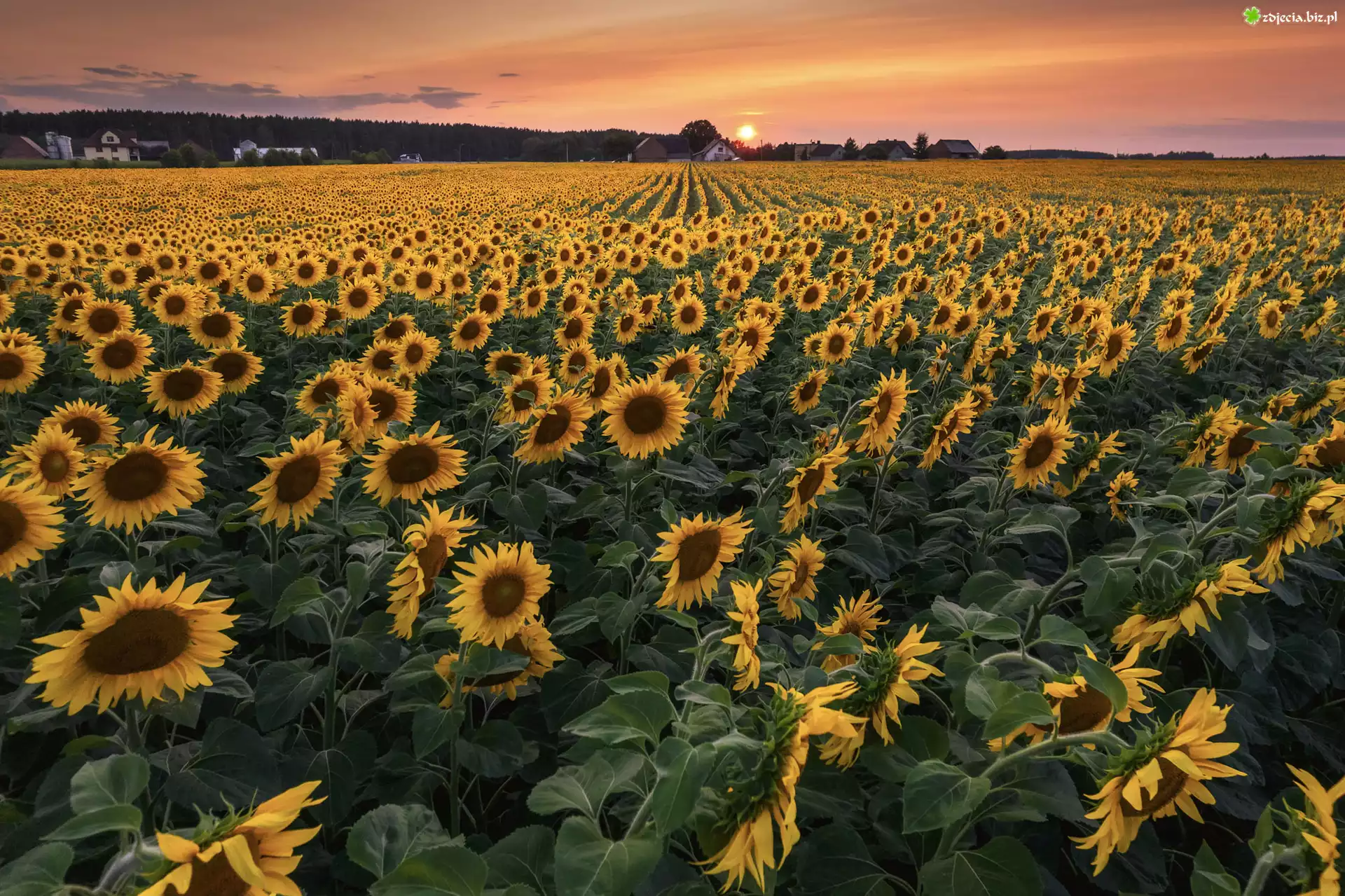 Zdjęcie Pole, Żółte, Słoneczniki, Zachód słońca, Domy, Drzewa