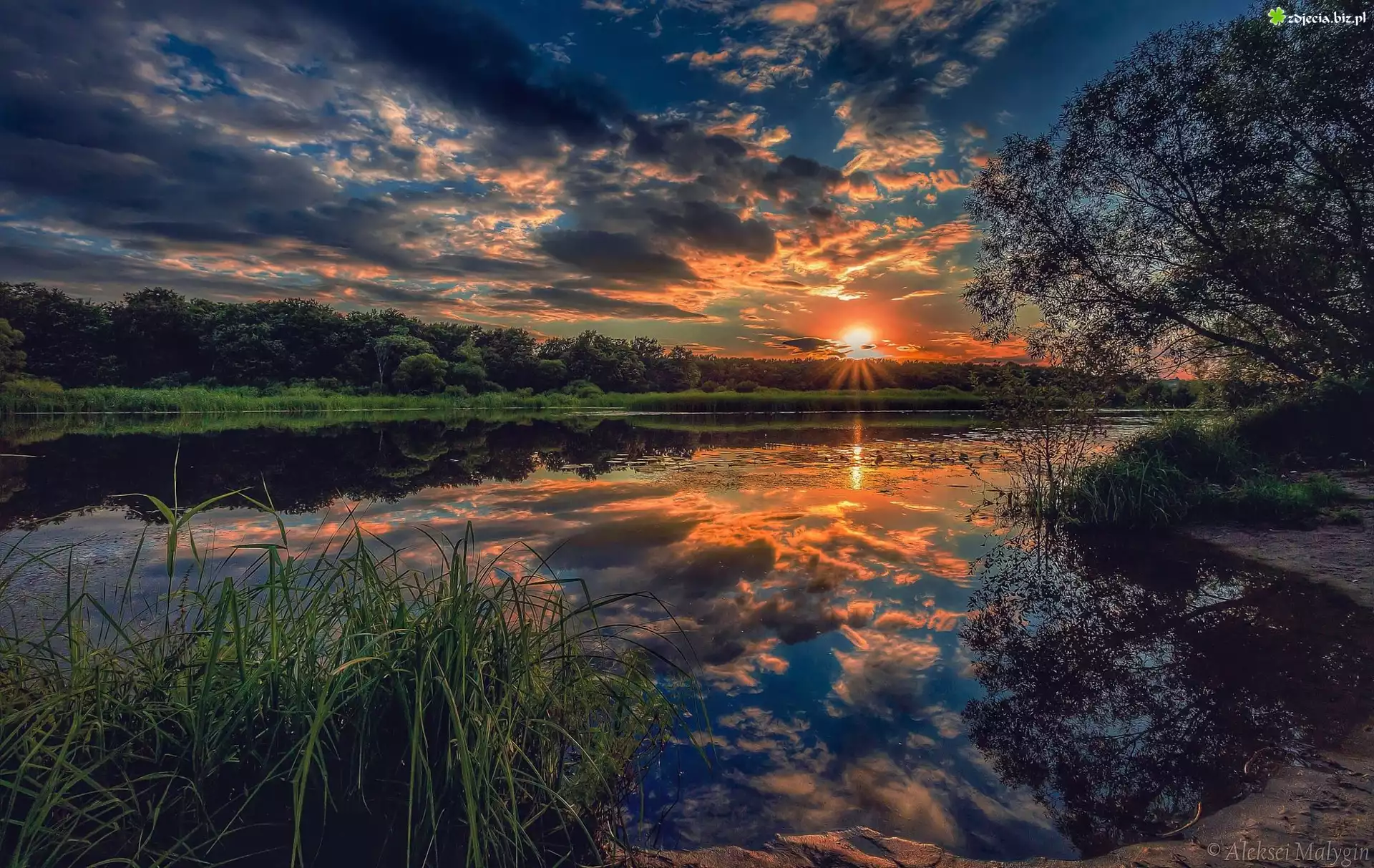 Zdjęcie, Zachód słońca, Jezioro, Szuwary, Drzewa