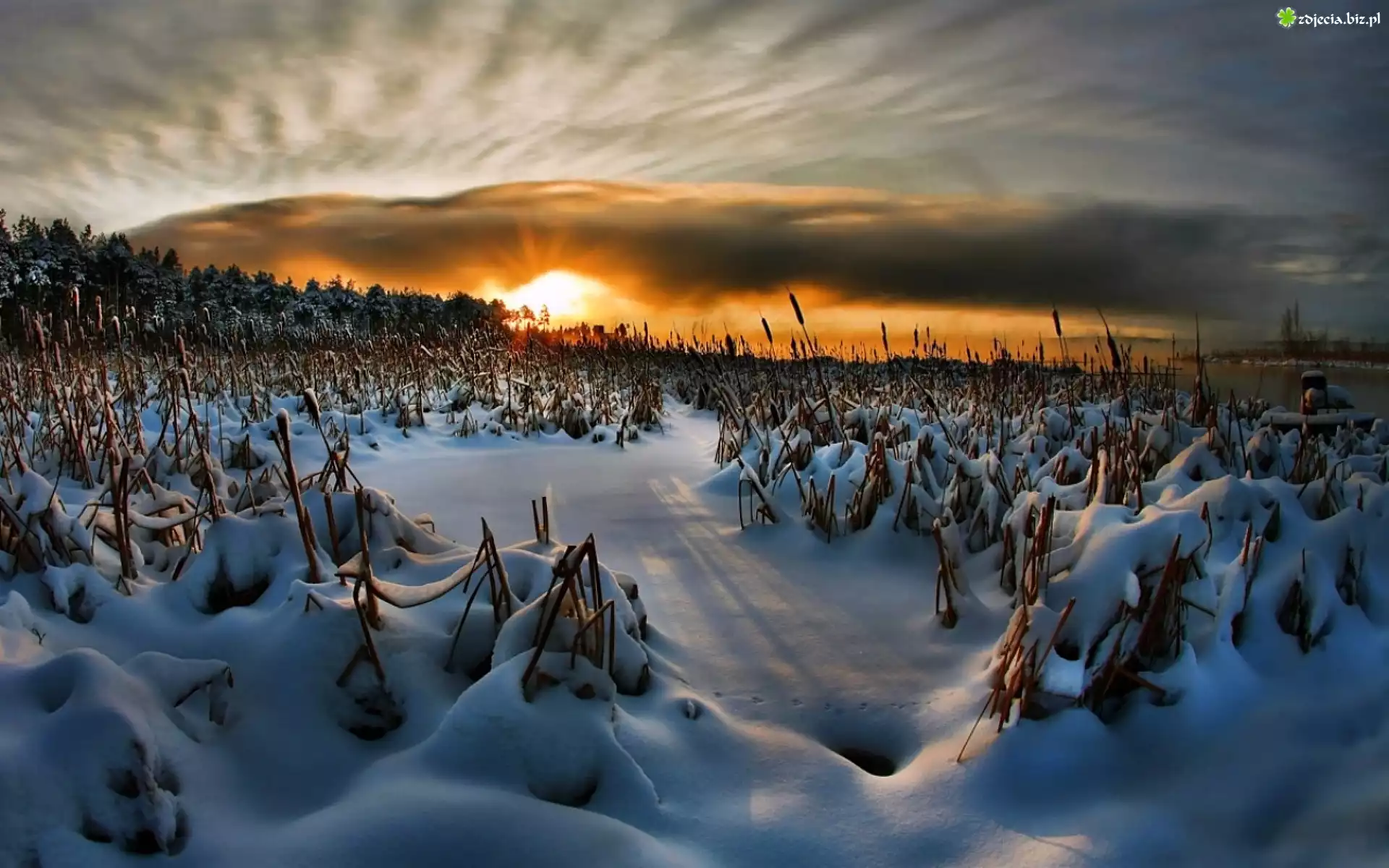 Zdjęcie Zachód, Słońca, Szuwary, Śnieg
