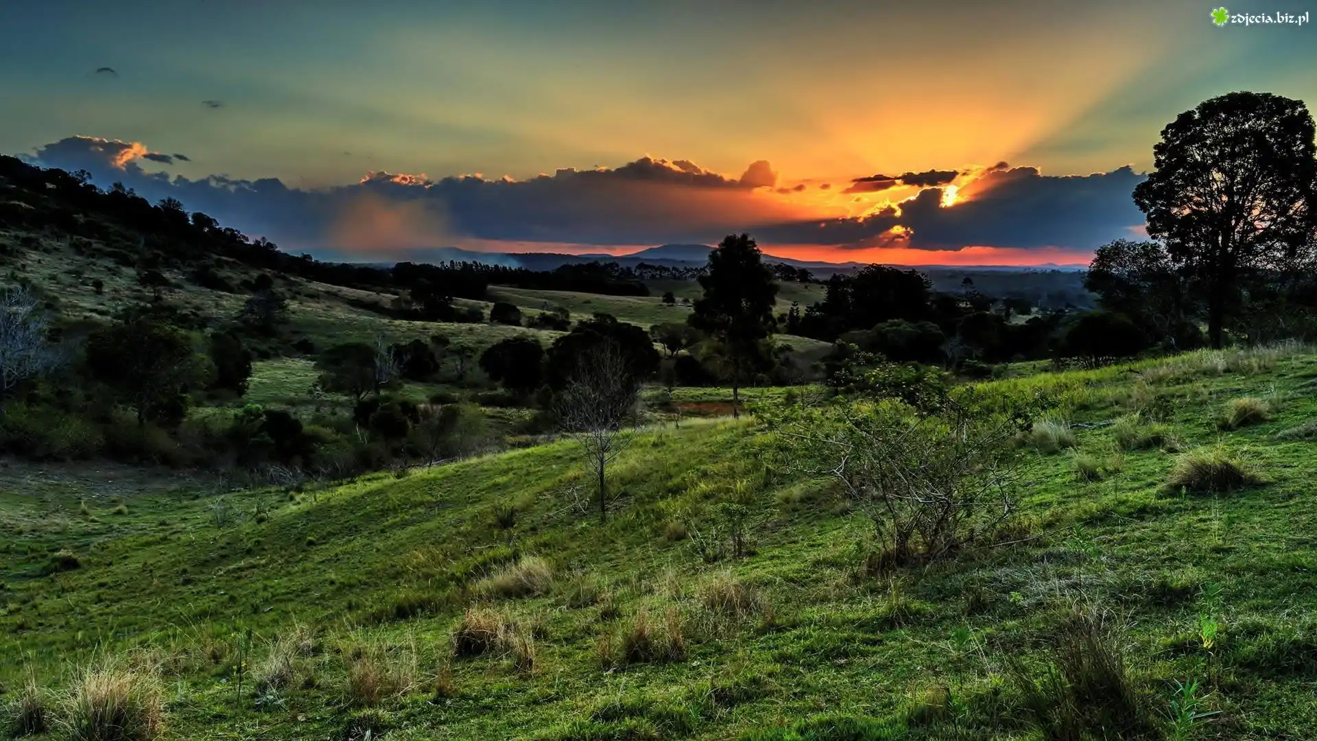Zdjęcie Zachód, Słońca, Chmury, Trawy, Drzewa