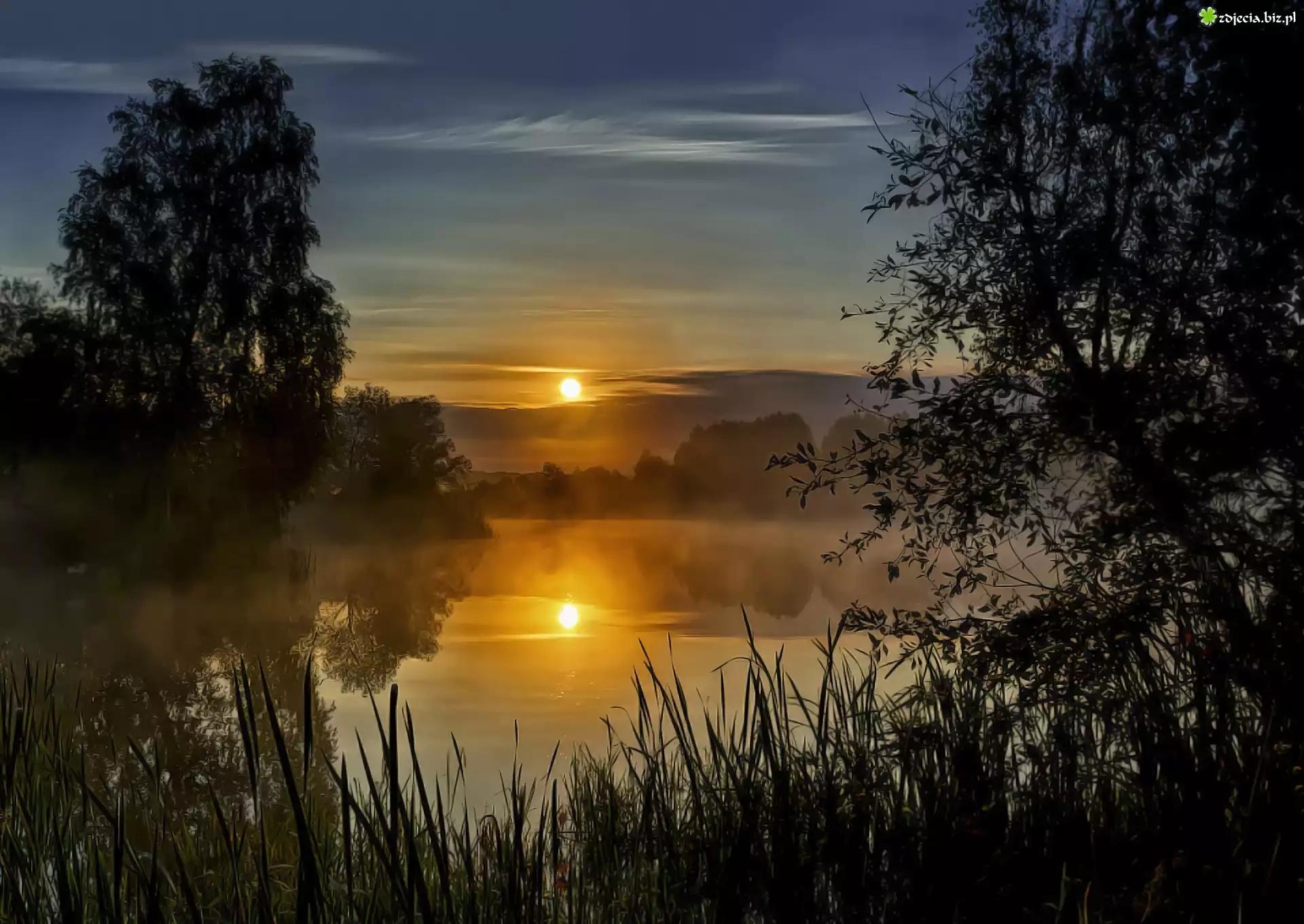 Zdjęcie Zachód, Słońca, Jezioro, Mgła, Trawy, Drzewa