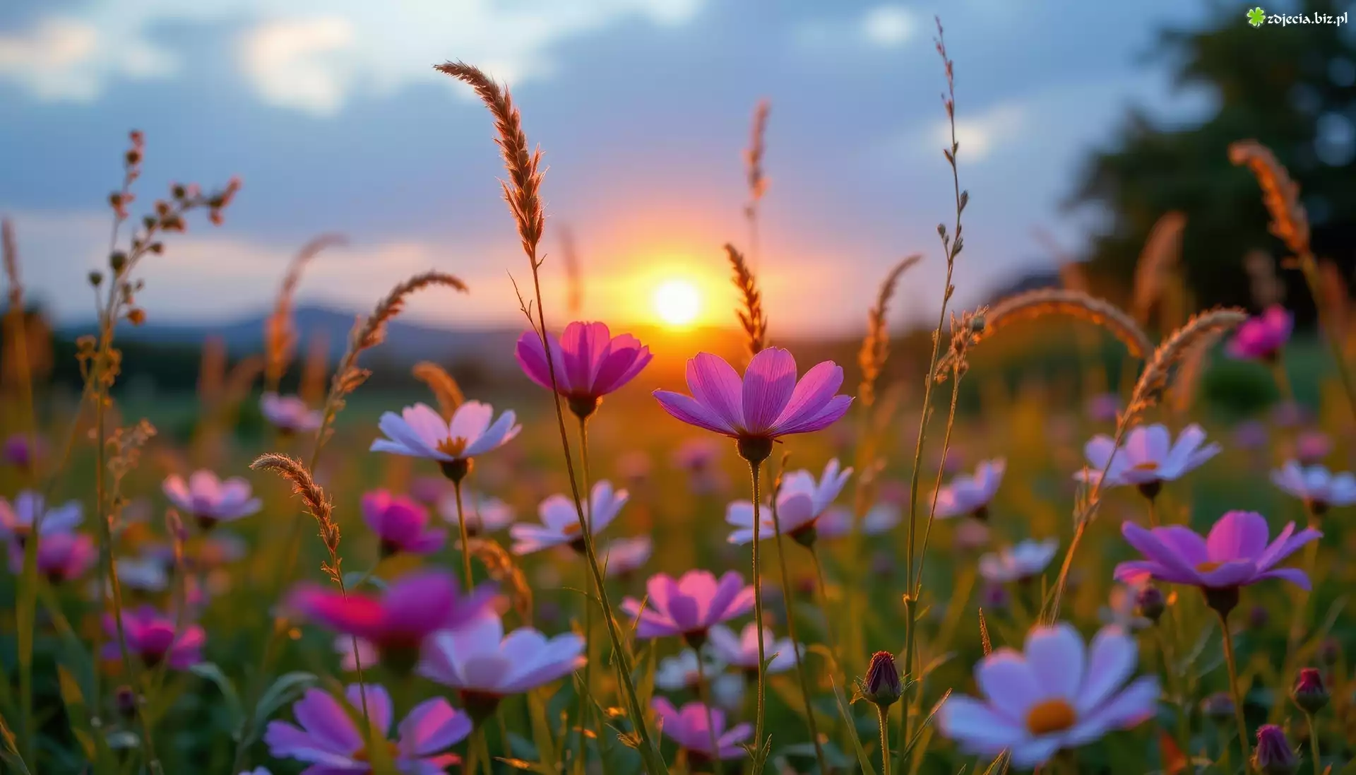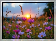 Zdjęcie Łąka, Kosmea, Trawy, Zachód słońca, Grafika AI