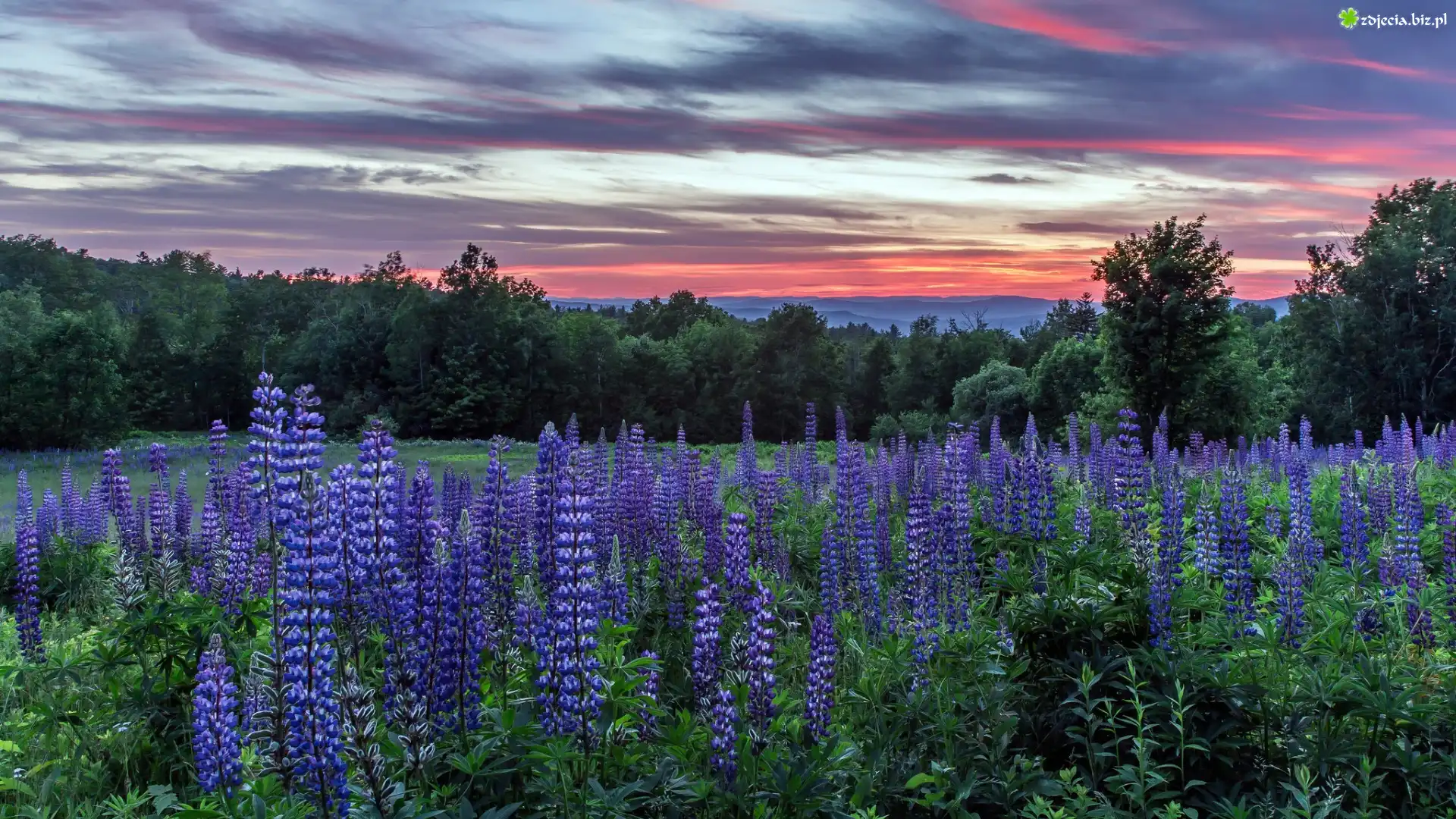 Zdjęcie Łąka, Łubin, Drzewa, Zachód słońca