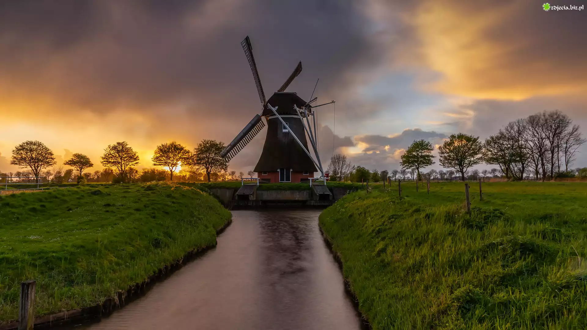 Zdjęcie Rzeka, Pole, Drzewa, Zachód słońca, Wiatrak