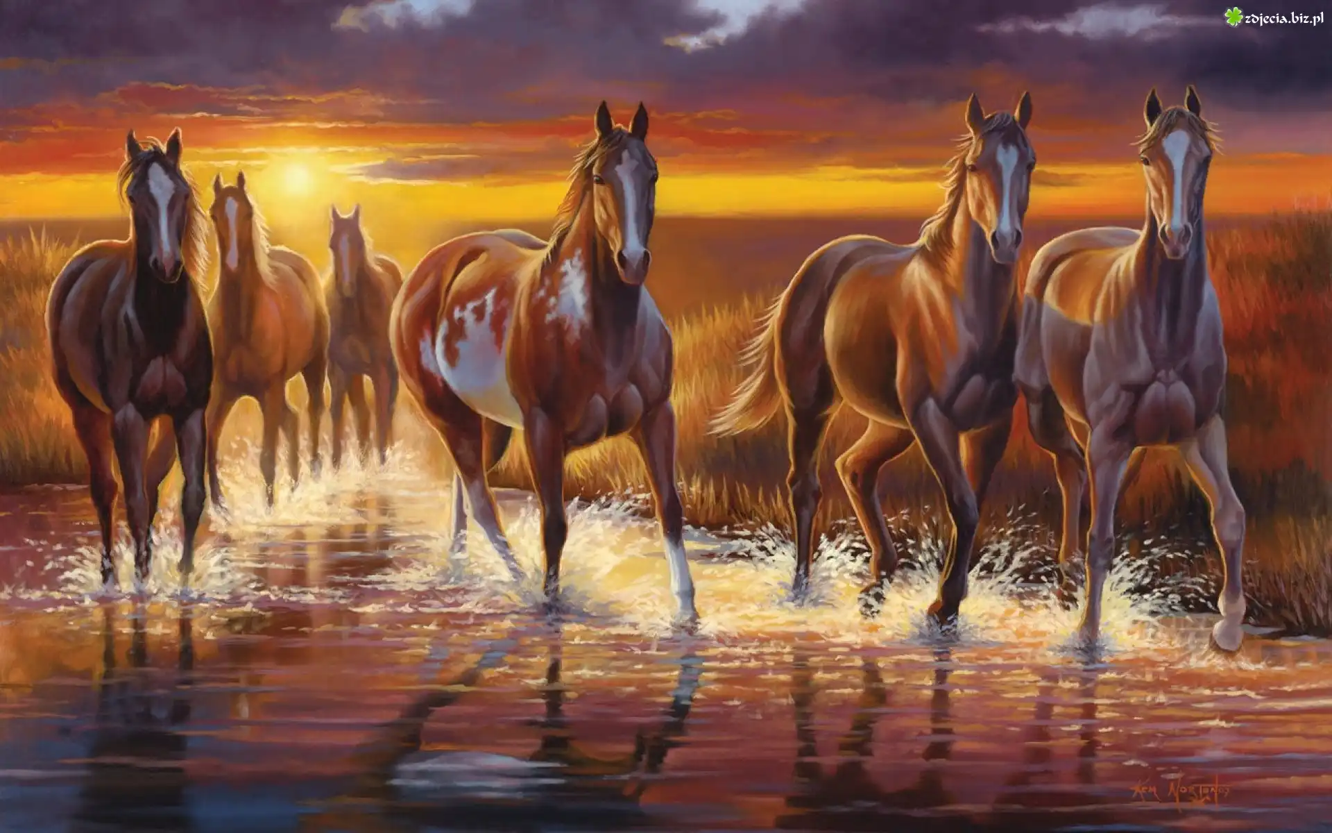 Zdjęcie Zachód, Słońca, Konie, Woda, Art