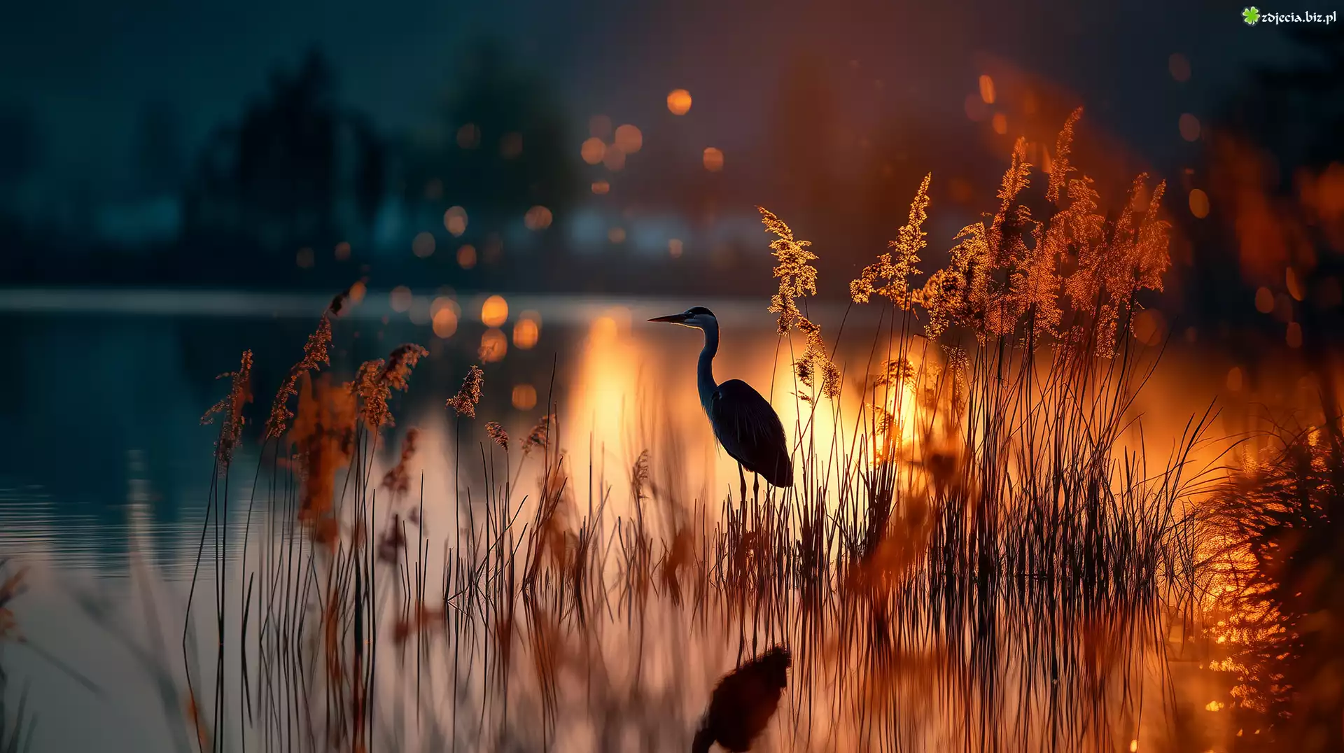 Zdjęcie Czapla, Trawy, Woda, Zachód słońca, Grafika AI