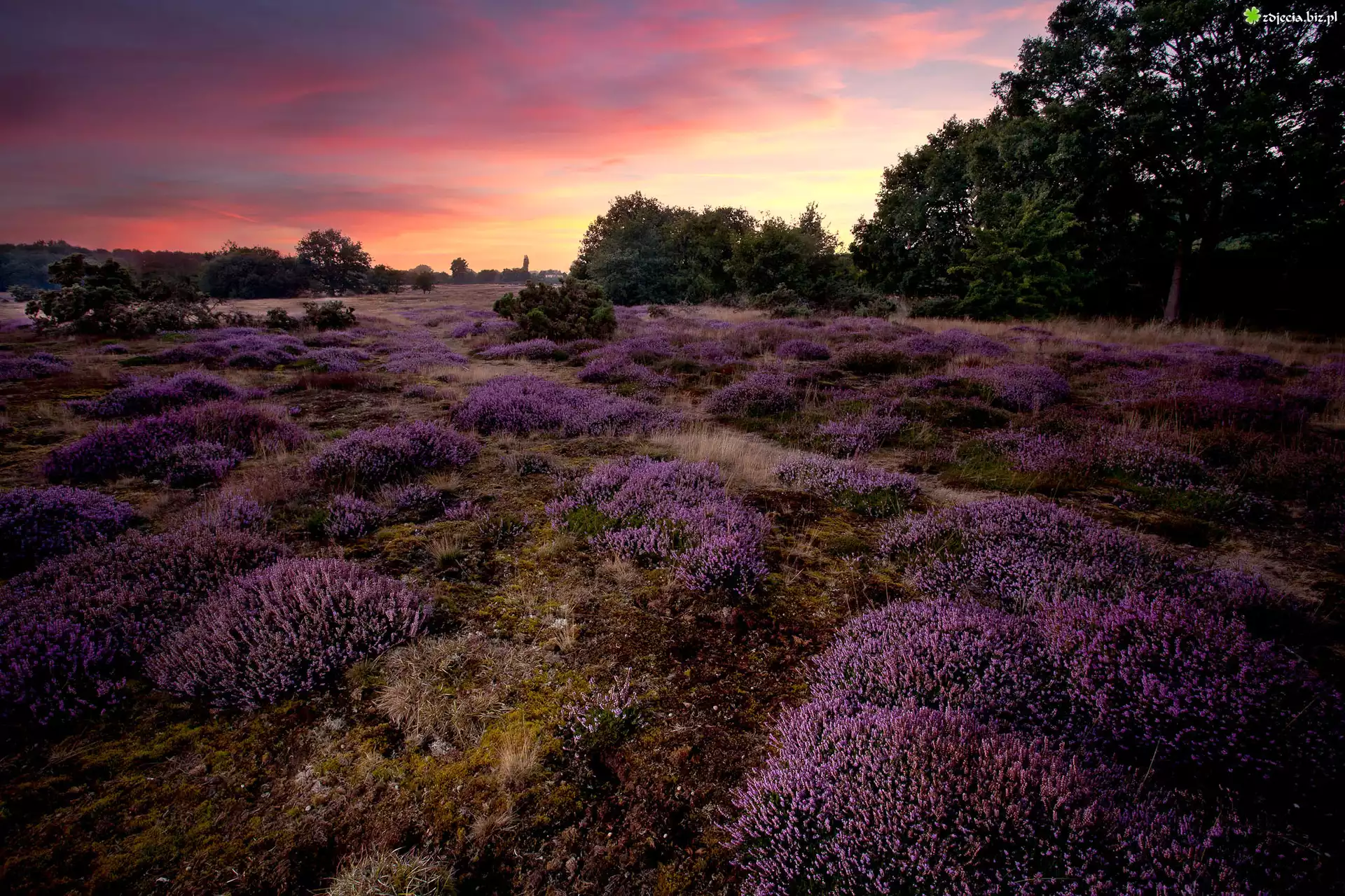 Zdjęcie Zachód słońca, Wrzosowisko, Wrzos, Drzewa