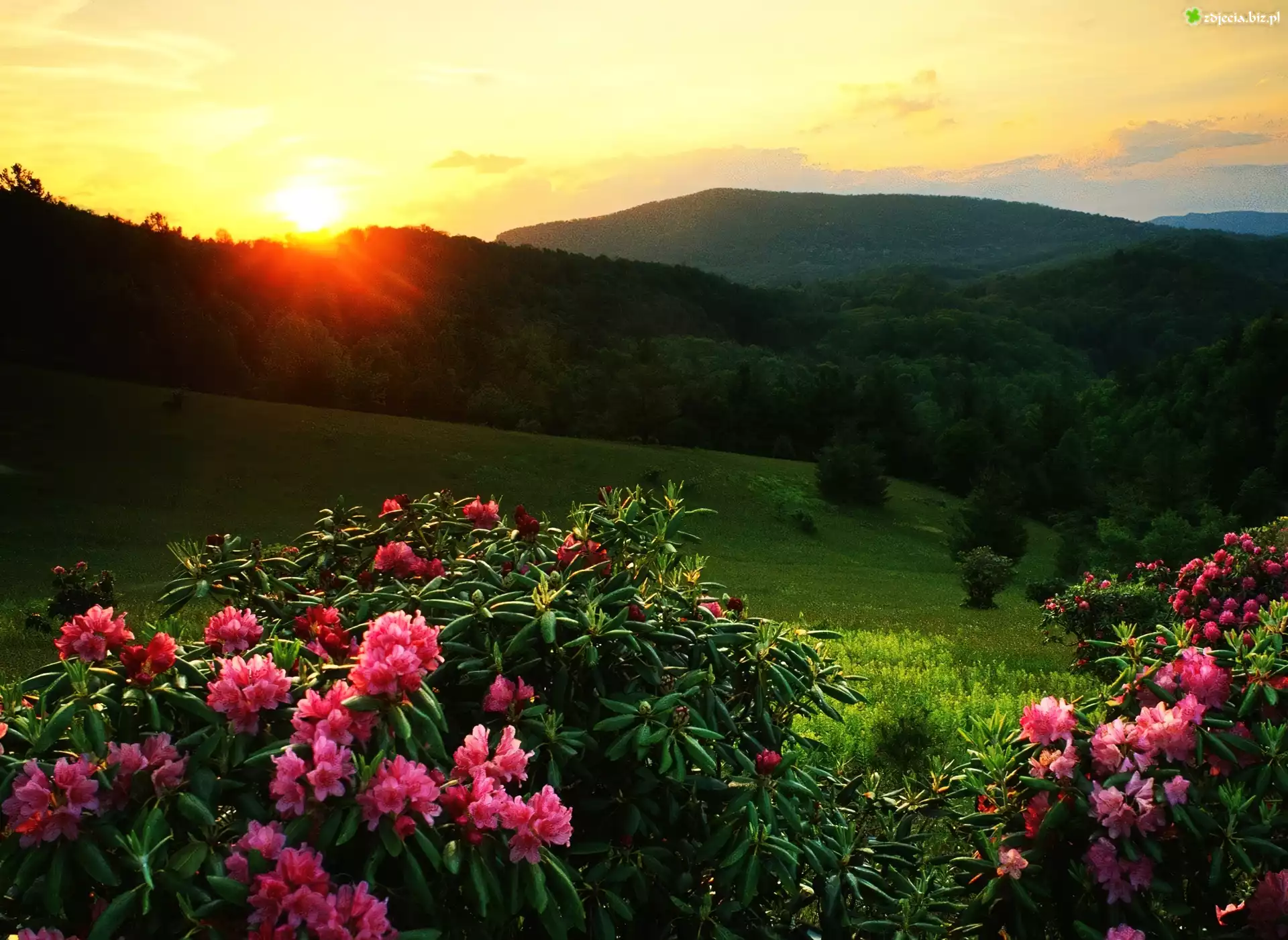 Zdjęcie Zachód, Słońca, Wzgórza, Rododendrony