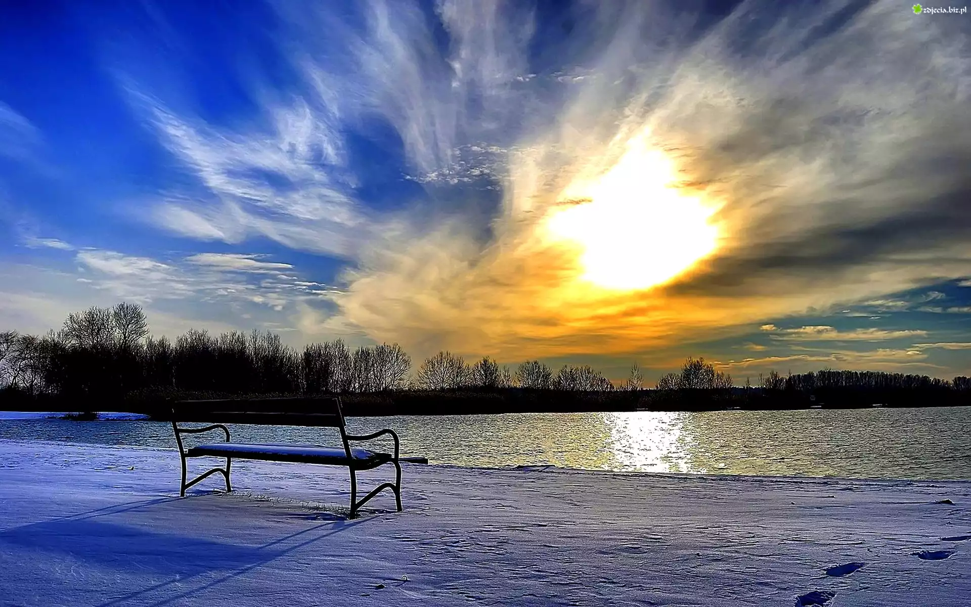 Zdjęcie Zachód Słońca, Jezioro, Zima, Ławka