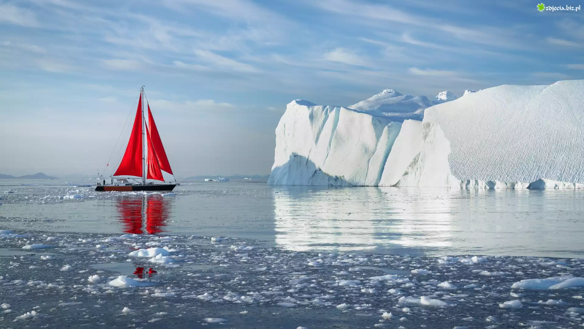 Zdjęcie Morze, Góra lodowa, Żaglówka, Czerwone, Żagle