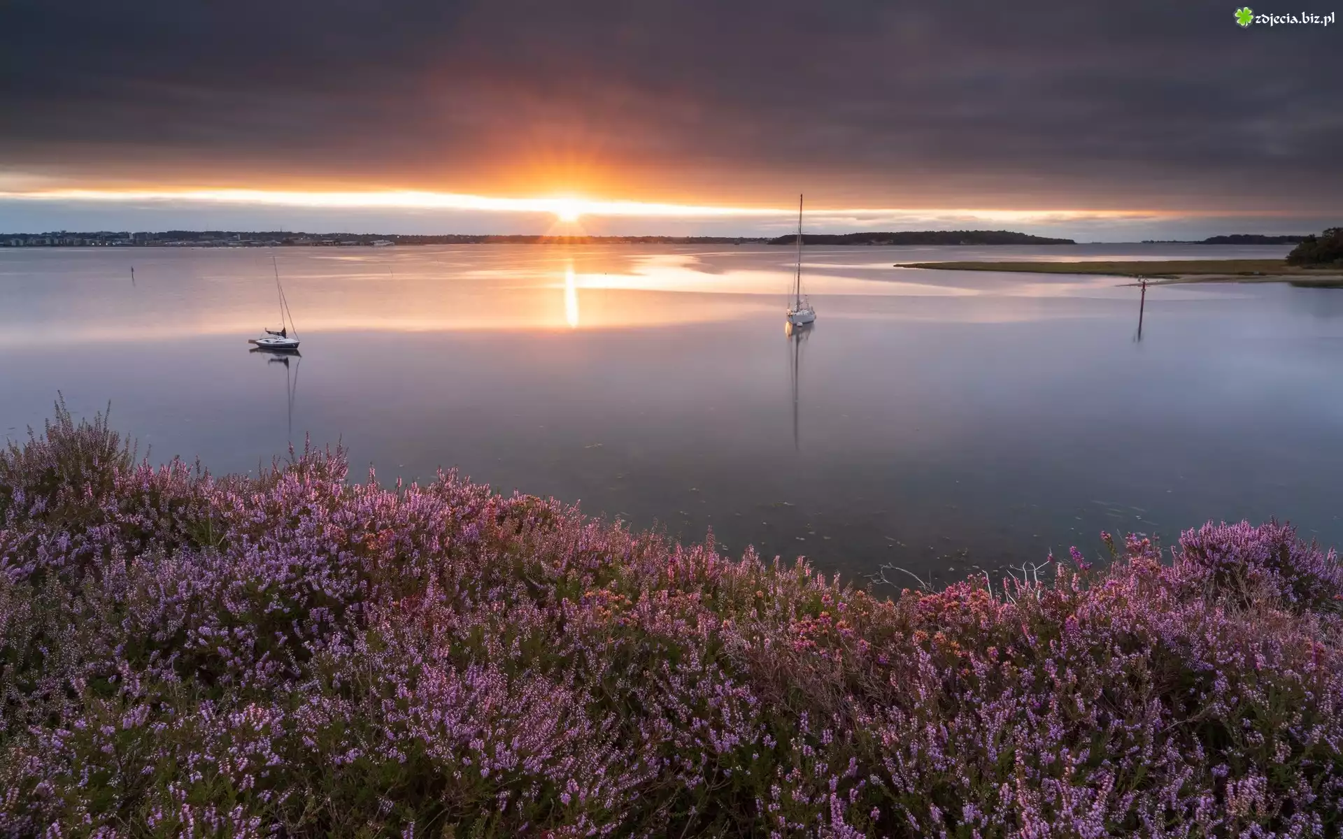 Zdjęcie, Jezioro, Żaglówki, Roślinność, Zachód słońca