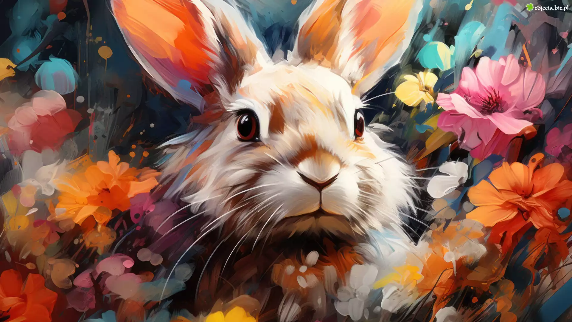 Zdjęcie Królik, Zając, Kolorowe, Kwiaty, Malarstwo