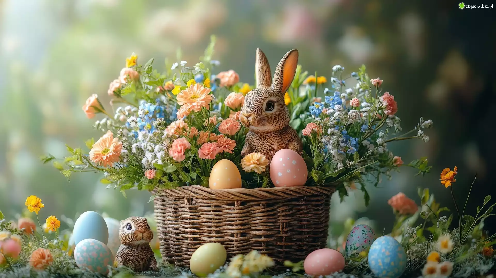 Zdjęcie Wielkanoc, Zajączek, Koszyk, Pisanki, Kwiaty
