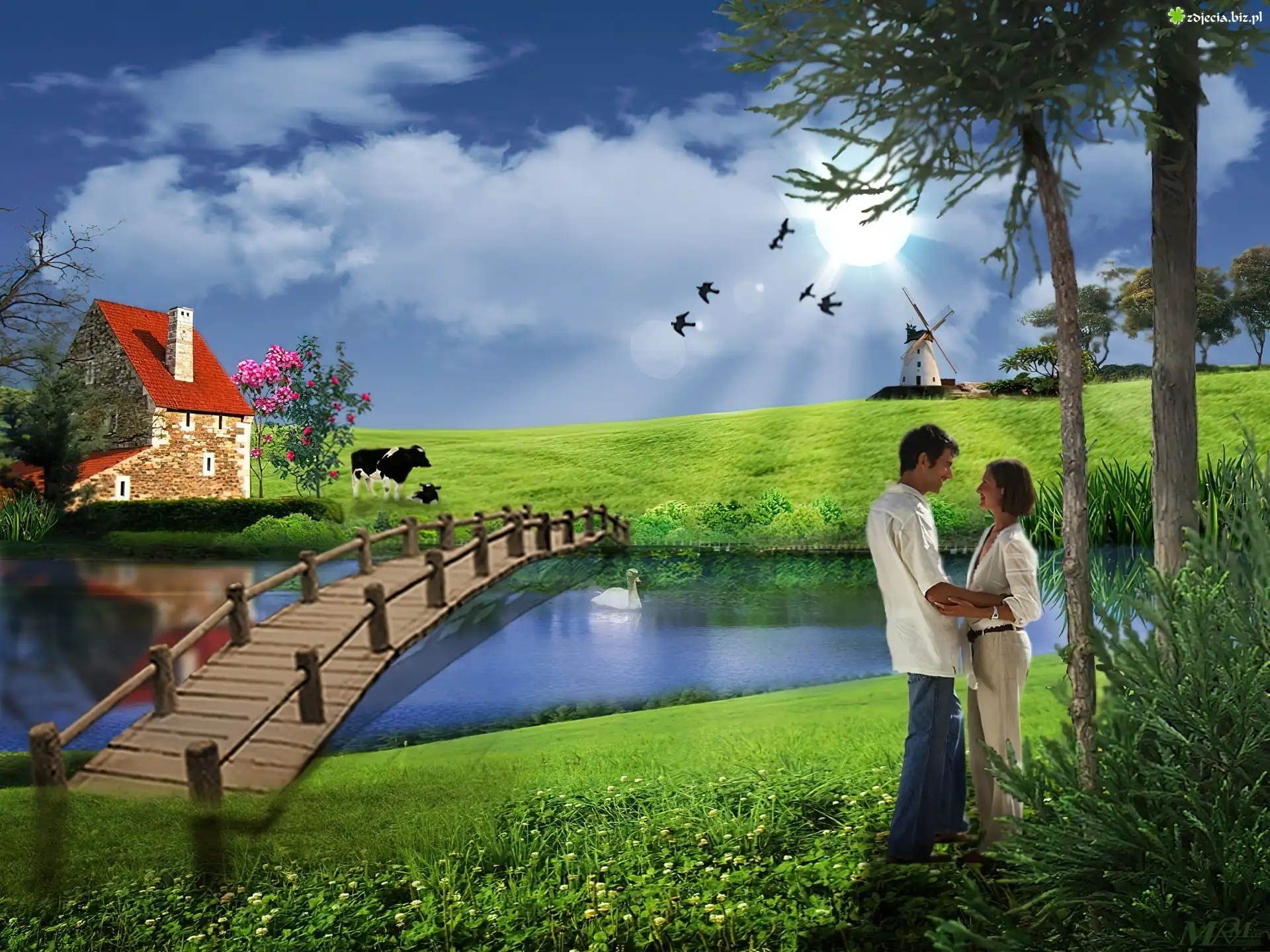 Zdjęcie Zakochani, Łąka, Rzeczka, Kładka, Domek