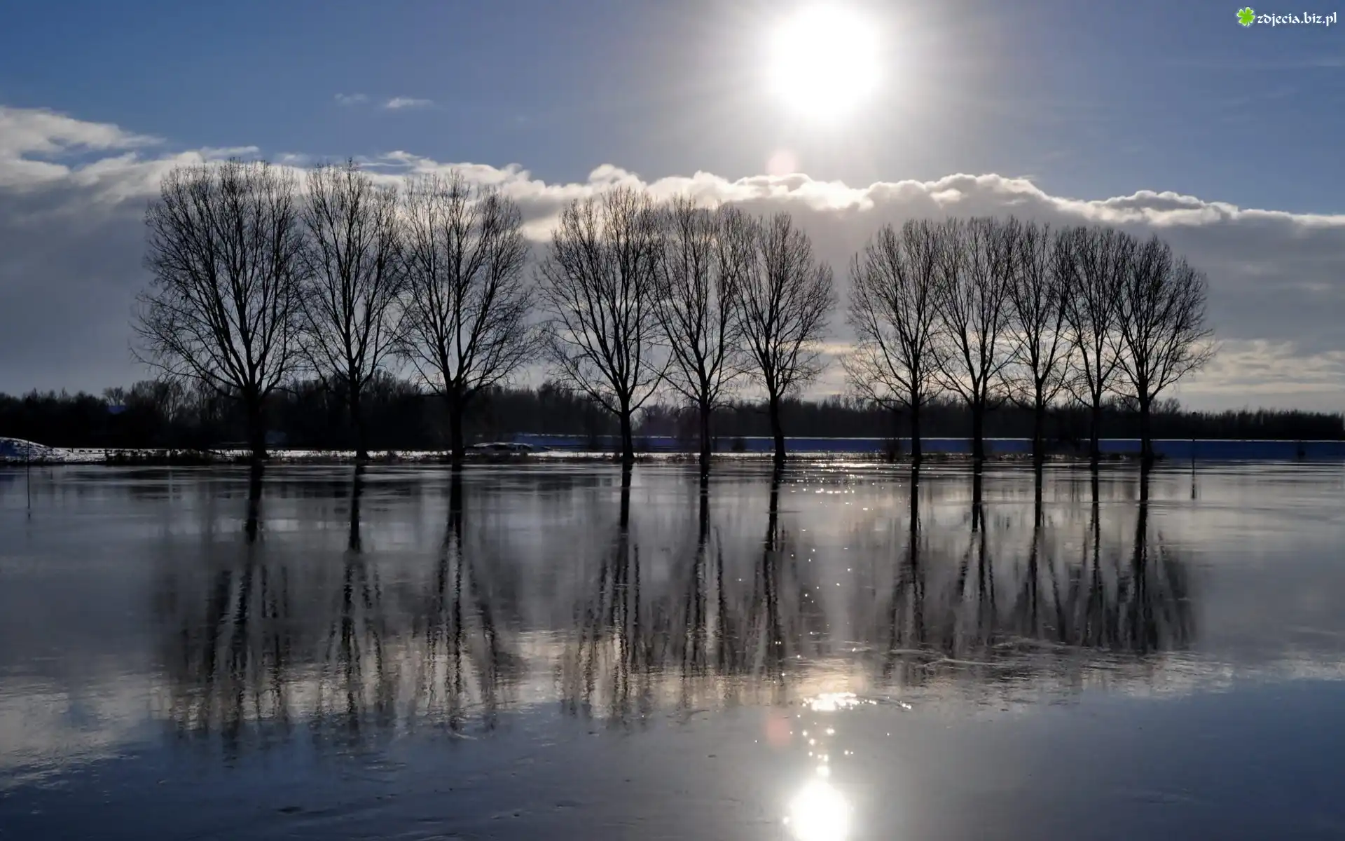 Zdjęcie Zamarznięte, Jezioro, Drzewa, Słońce, Odbicie