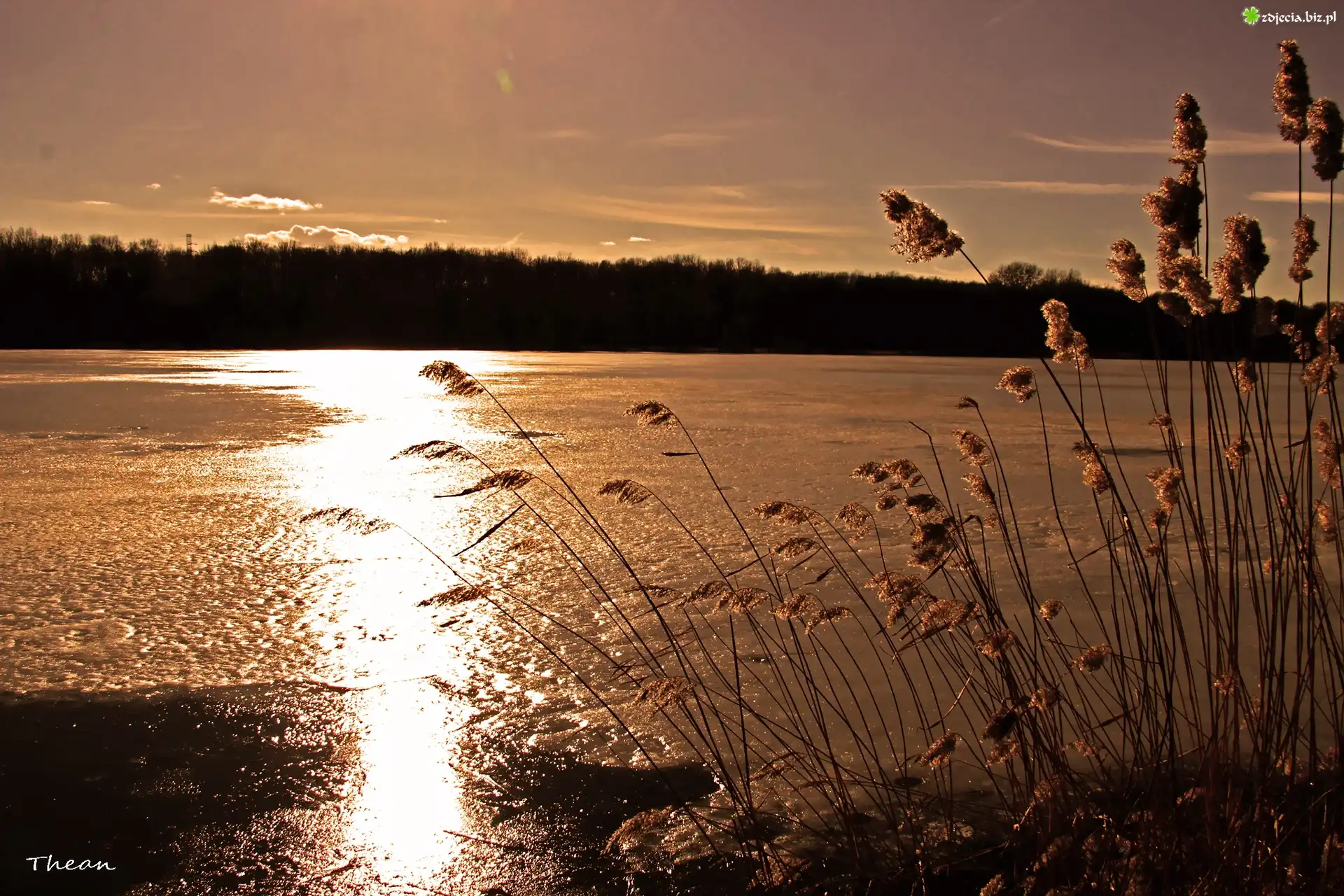 Zdjęcie Zamarznięte, Jezioro, Sucha, Trzcina, Zachód Słońca