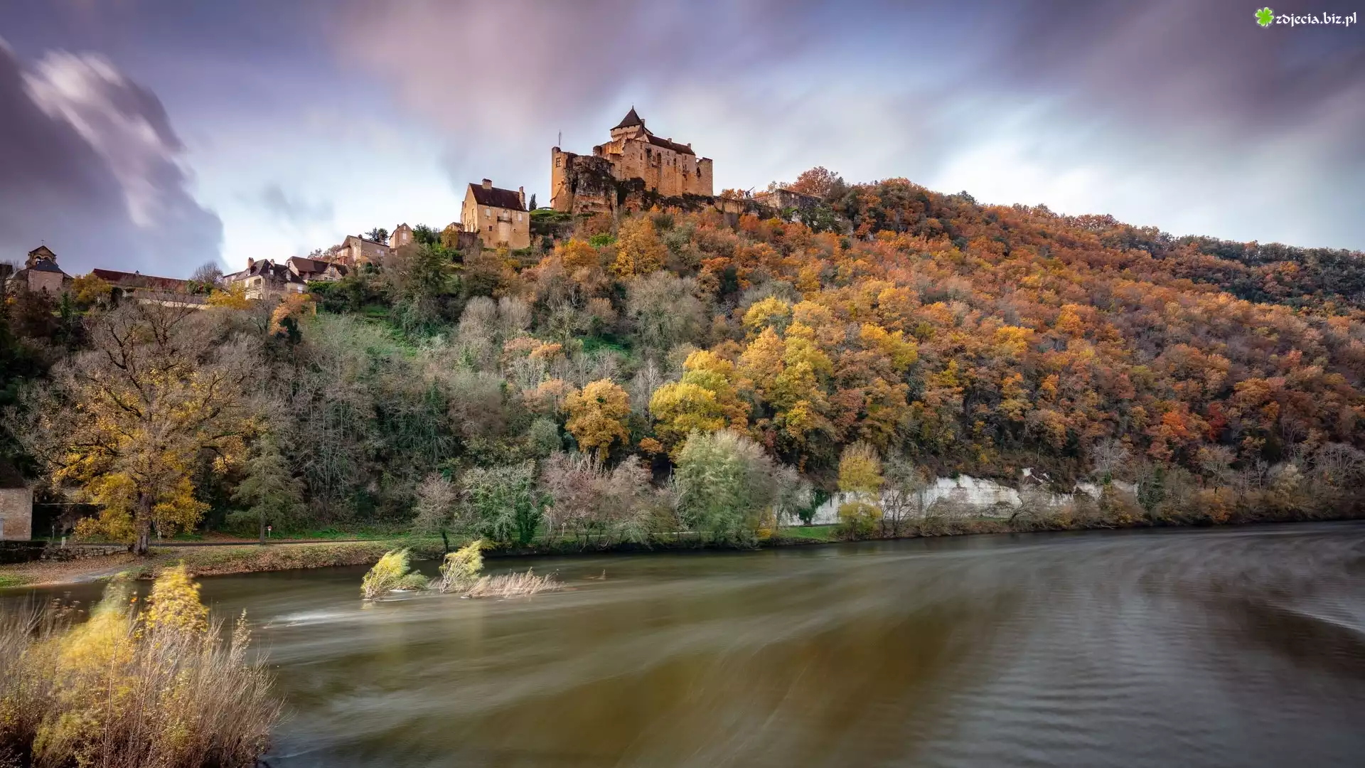 Zdjęcie Francja, Castelnaud la Chapelle, Rzeka Dordogne, Twierdza, Zamek Castelnaud la Chapelle Castle, Wzgórze, Drzewa, Jesień |