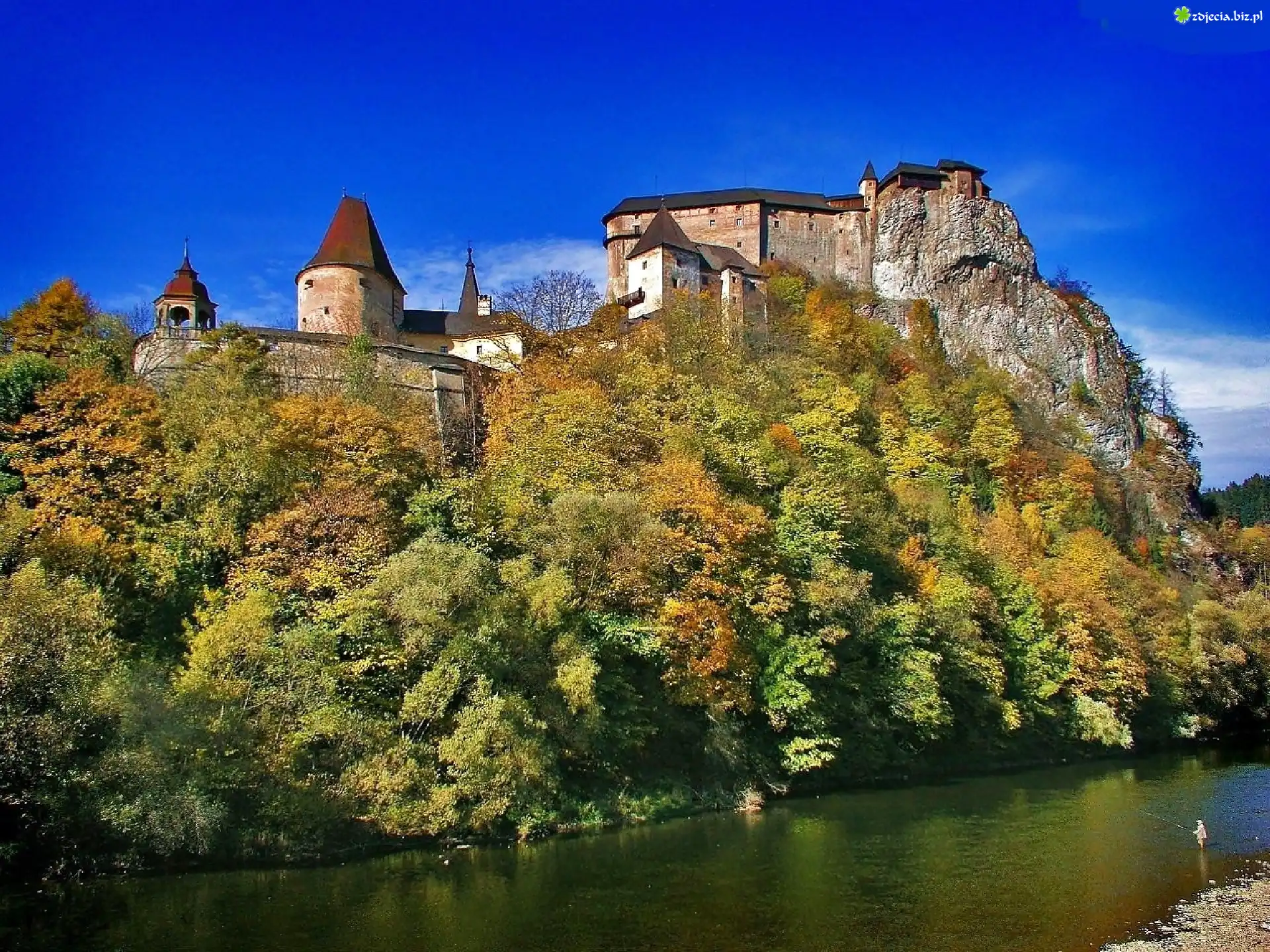 Zdjęcie Słowacja, Zamek Orawski, Wzgórze, Drzewa, Rzeka Orawa