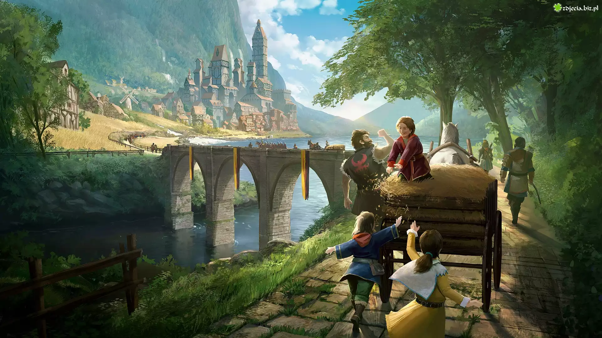 Zdjęcie Zamek, Rzeka, Most, Wóz, Dzieci, Fantasy