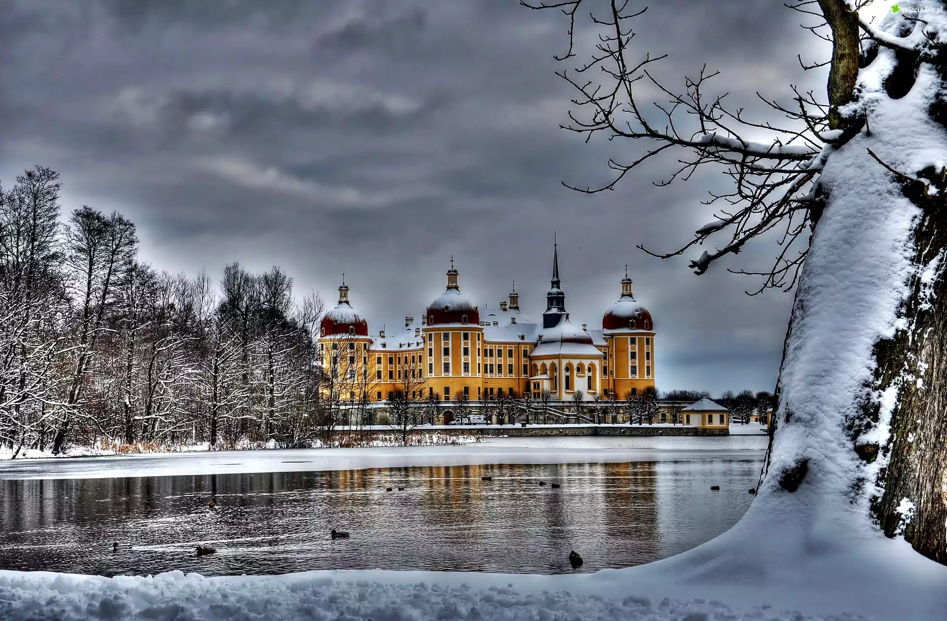 Zdjęcie Niemcy, Saksonia, Miejscowość Moritzburg, Zamek Moritzburg, Jezioro Waldesee, Śnieg, Zima, Drzewa |