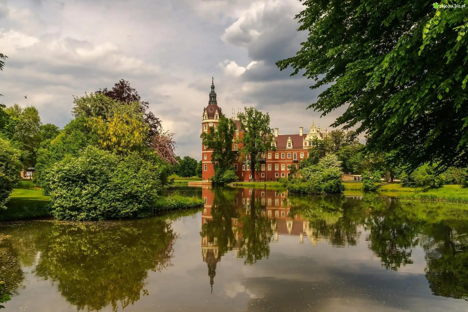Zdjęcie, Zamek Schloss Muskau, Zamek w Mużakowie, Jezioro, Mużaków, Saksonia, Niemcy