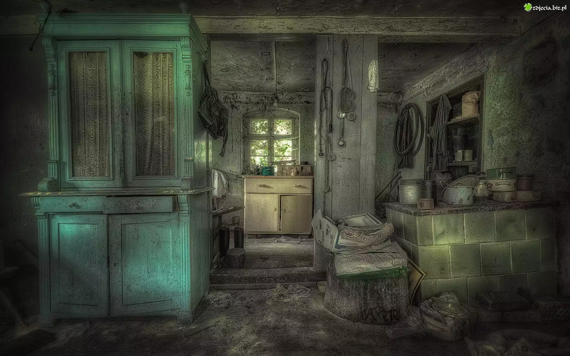 Zdjęcie, Zaniedbana, Kuchnia, Kaflowy, Piec, Zielony, Kredens