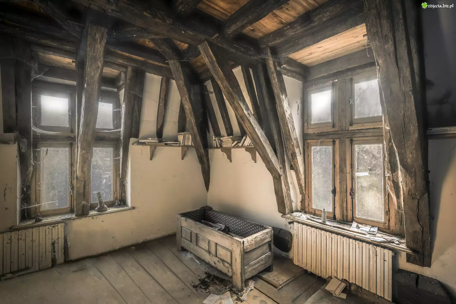 Zdjęcie Zaniedbane, Wnętrze, Okna, Belki, Skrzynia