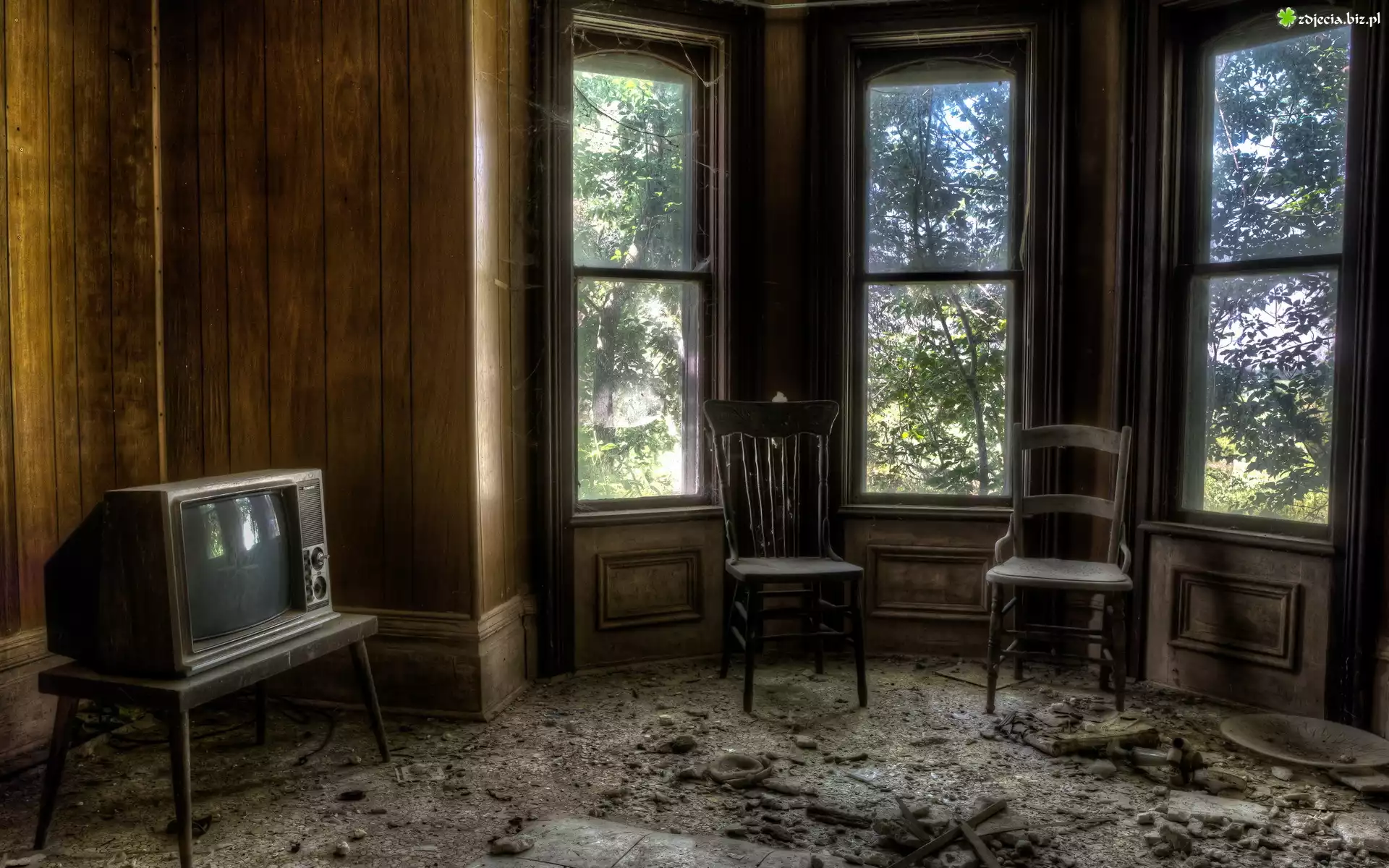 Zdjęcie Zaniedbany, Pokój, Bałagan, Telewizor, Krzesła, Okna