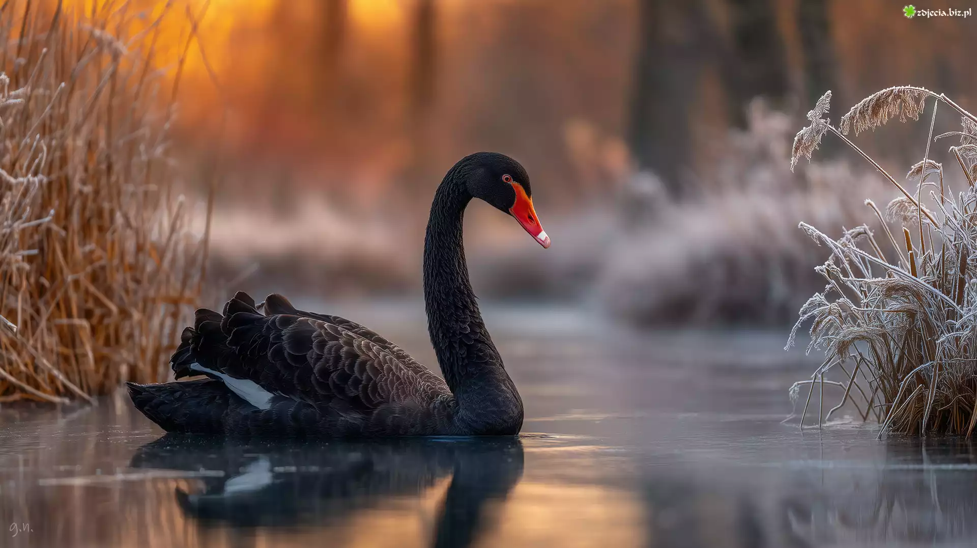 Zdjęcie Czarny, Łabędź, Staw, Zarośla, Grafika AI