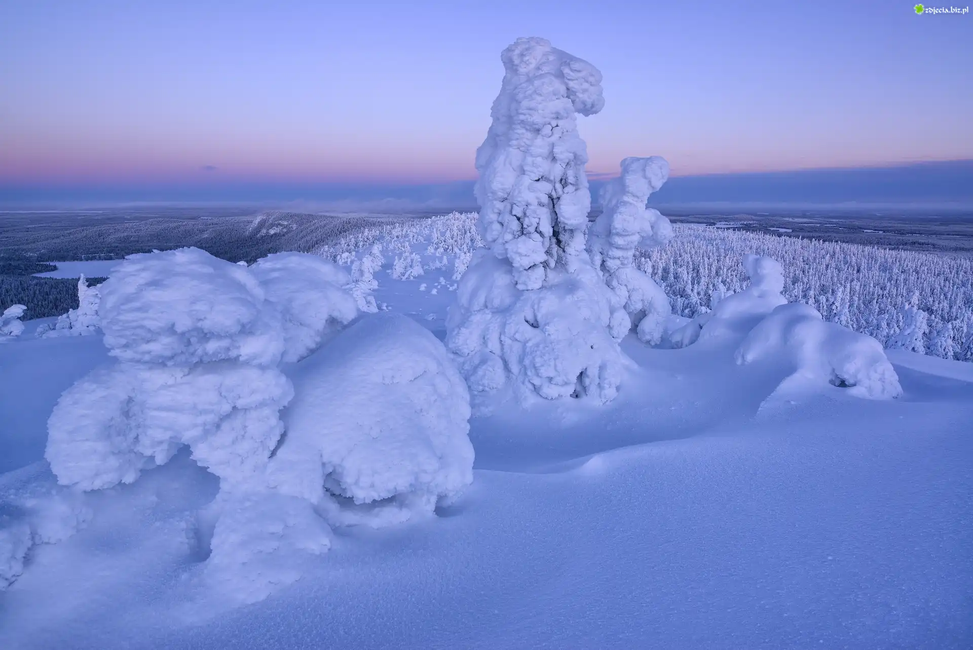Zdjęcie, Zima, Zaśnieżone, Drzewa, Rezerwat Valtavaara, Laponia, Finlandia