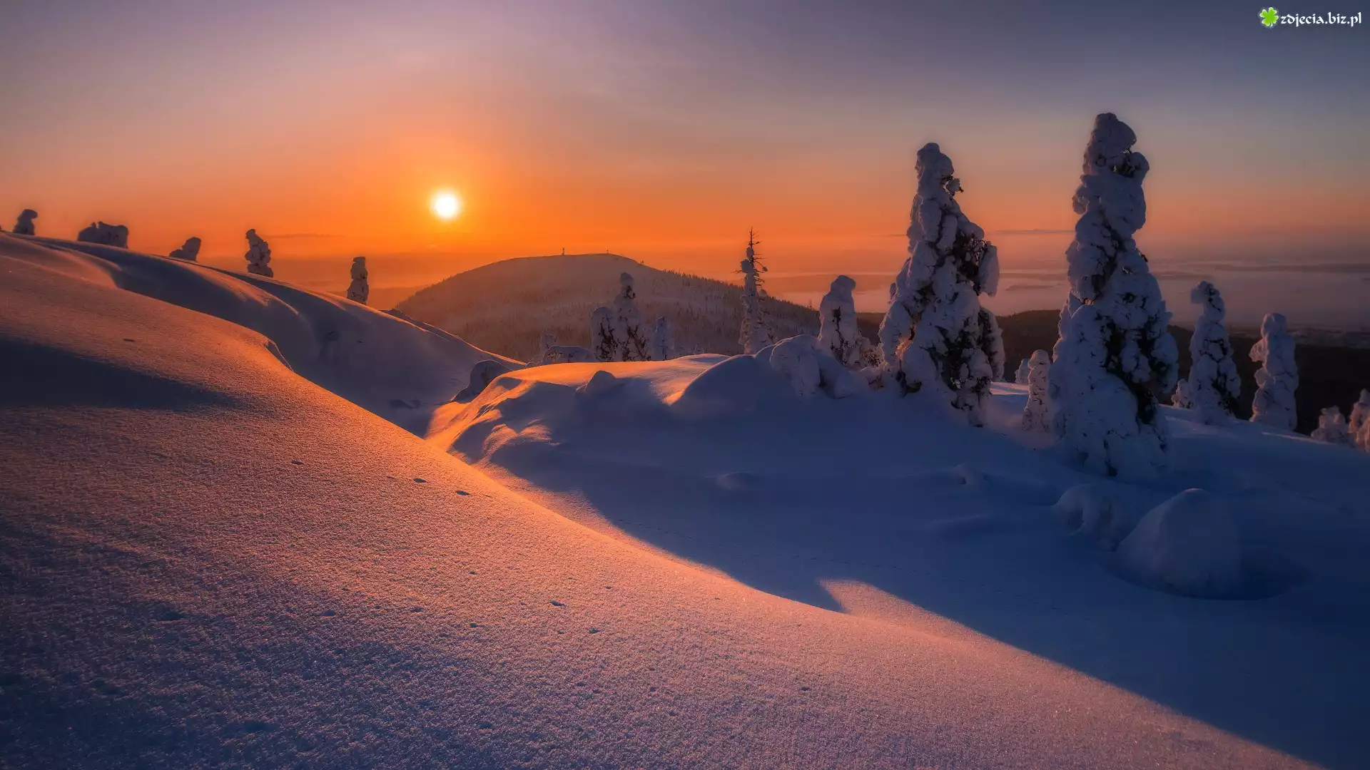 Zdjęcie Zima, Śnieg, Drzewa, Zaspy, Zachód słońca, Góra