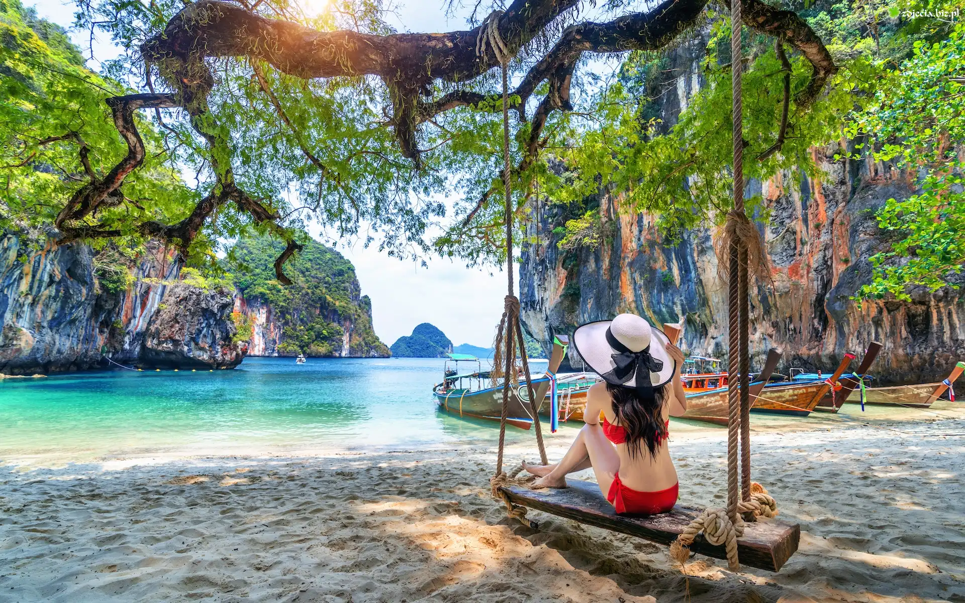 Zdjęcie Zatoka, Kobieta, Kapelusz, Huśtawka, Promienie słońca, Drzewo, Łodzie, Skały, Wyspa Ko Lao, Prowincja Krabi, Tajlandia |
