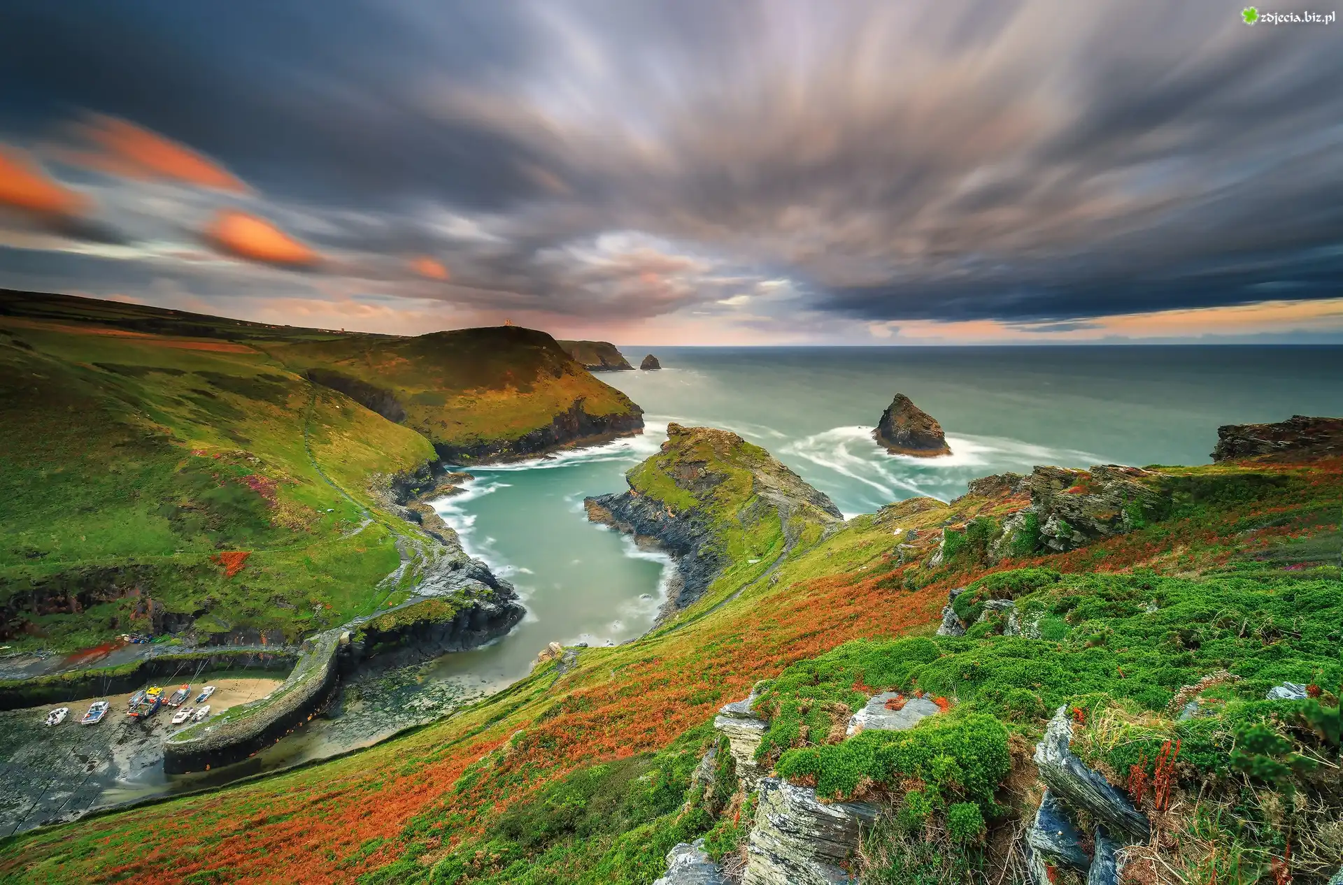 Zdjęcie Morze, Zatoka, Wybrzeże, Skały, Trawa, Łodzie, Chmury