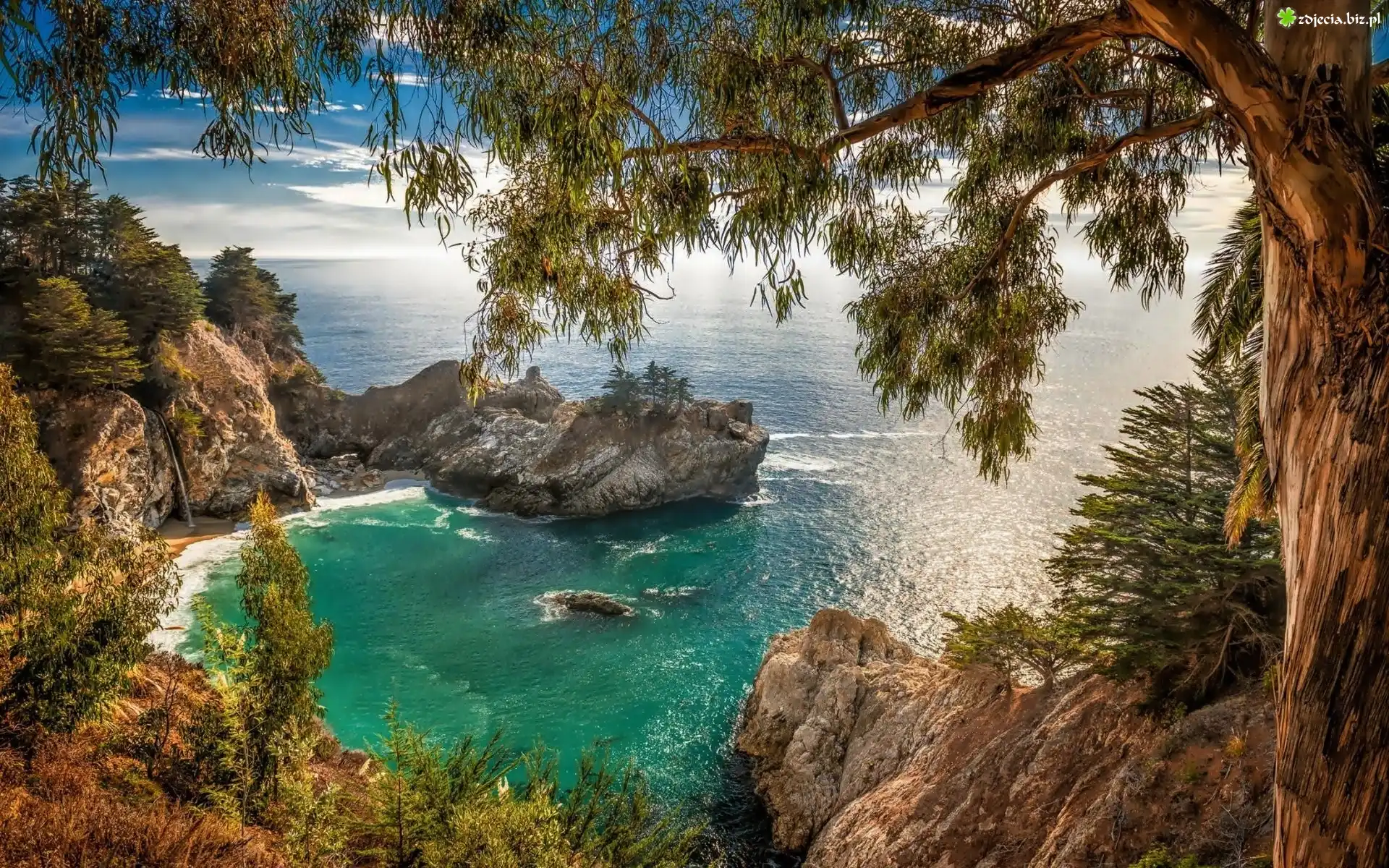 Zdjęcie Zatoka, Morze, Skały, Drzewa