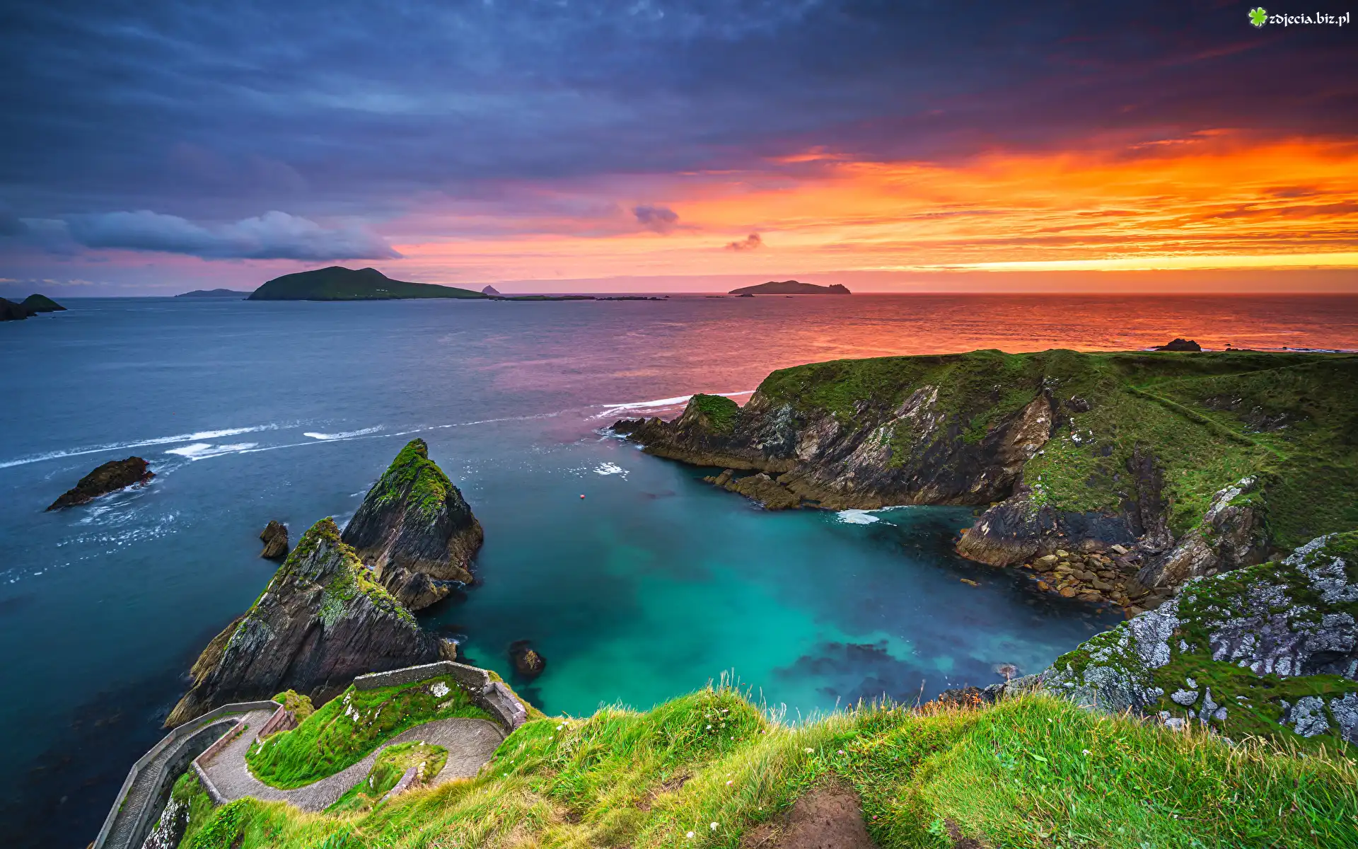 Zdjęcie Wybrzeże, Skały, Zatoka, Morze, Trawa, Chmury, Zachód słońca, Hrabstwo Kerry, Irlandia |