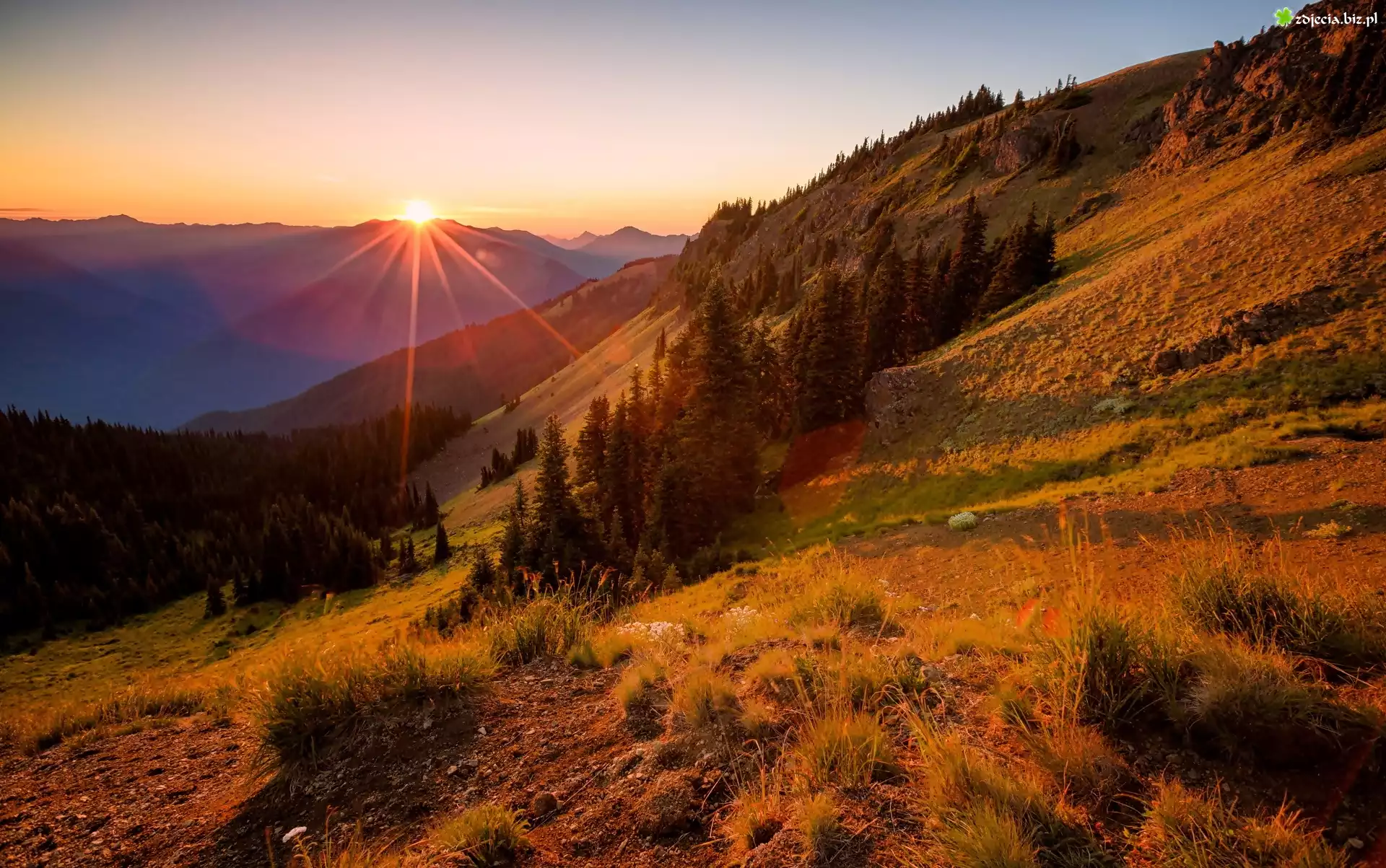 Zdjęcie Zbocze, Góry, Lasy, Promienie, Słońca, Jesień