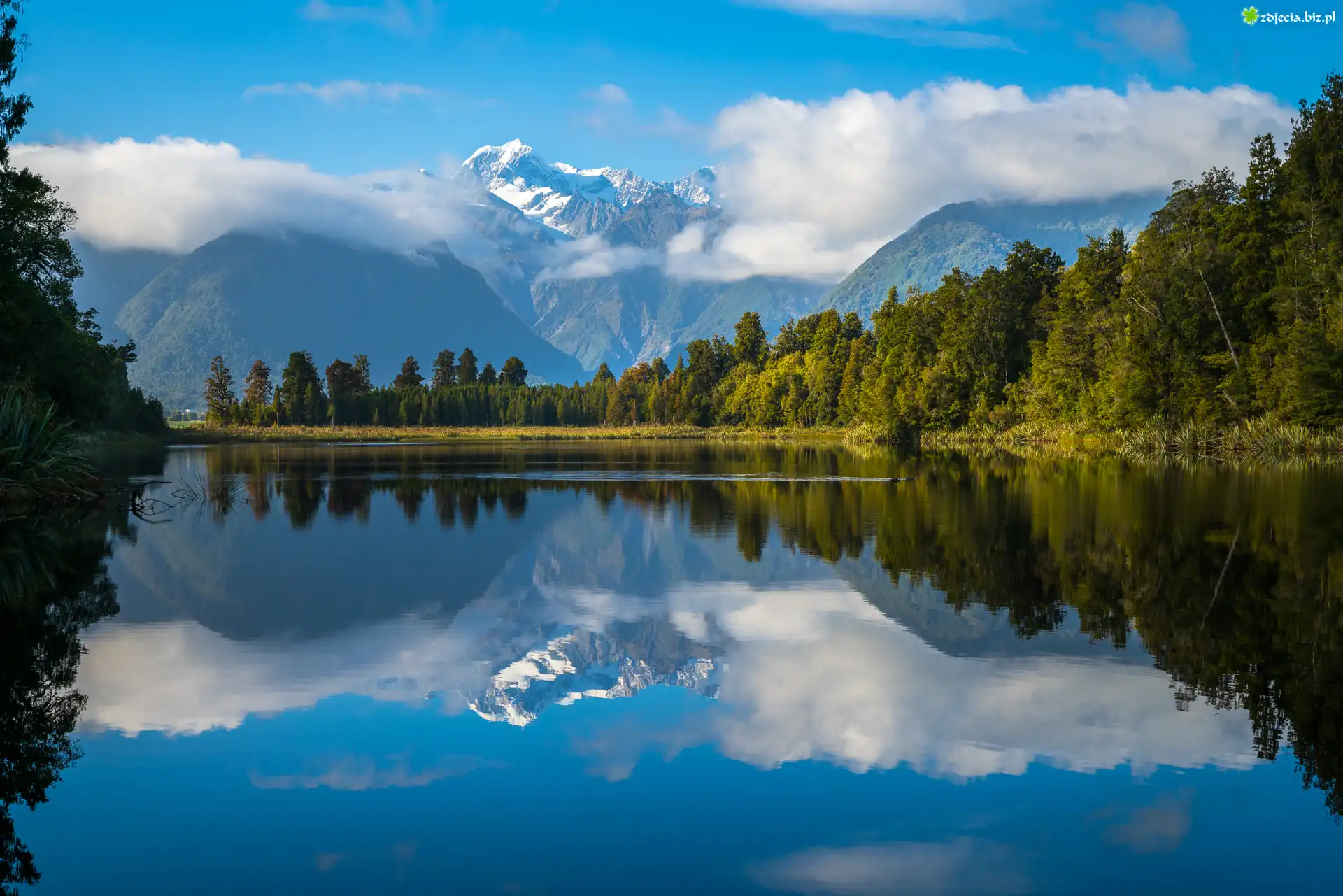 Zdjęcie, Nowa Zelandia, Góry, Jezioro Lake Matheson, Drzewa, Odbicie, Park Narodowy Góry Cooka