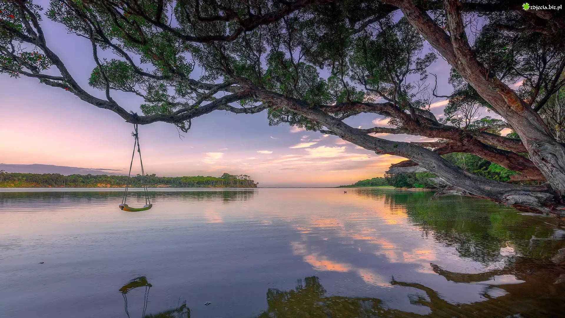 Zdjęcie Wschód słońca, Rzeka, Tahakopa River, Drzewo, Gałęzie, Huśtawka, Nowa Zelandia