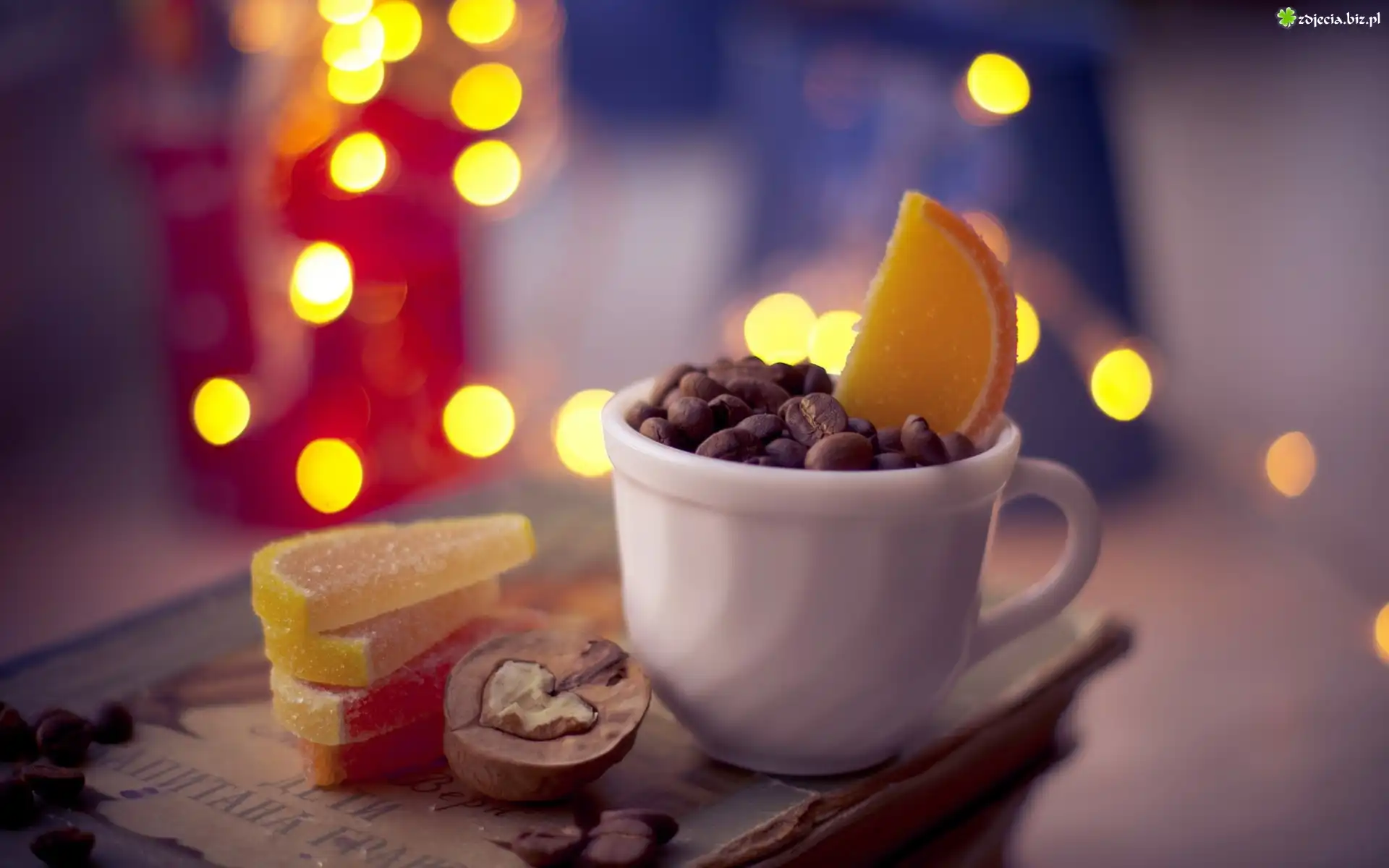 Zdjęcie Filiżanka, Ziarna, Kawa, Plastry, Cytryny, Orzech, Blask