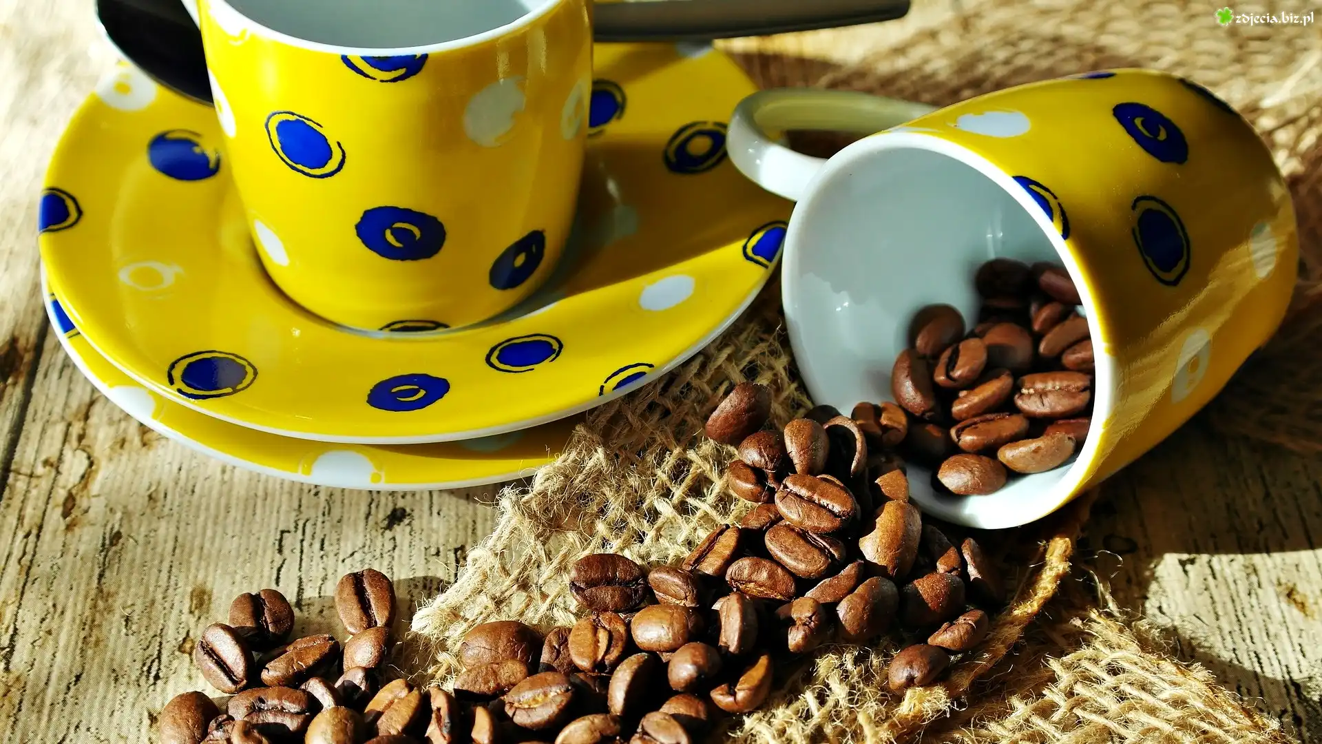Zdjęcie Żółte, Filiżanki, Talerzyki, Ziarna, Kawa