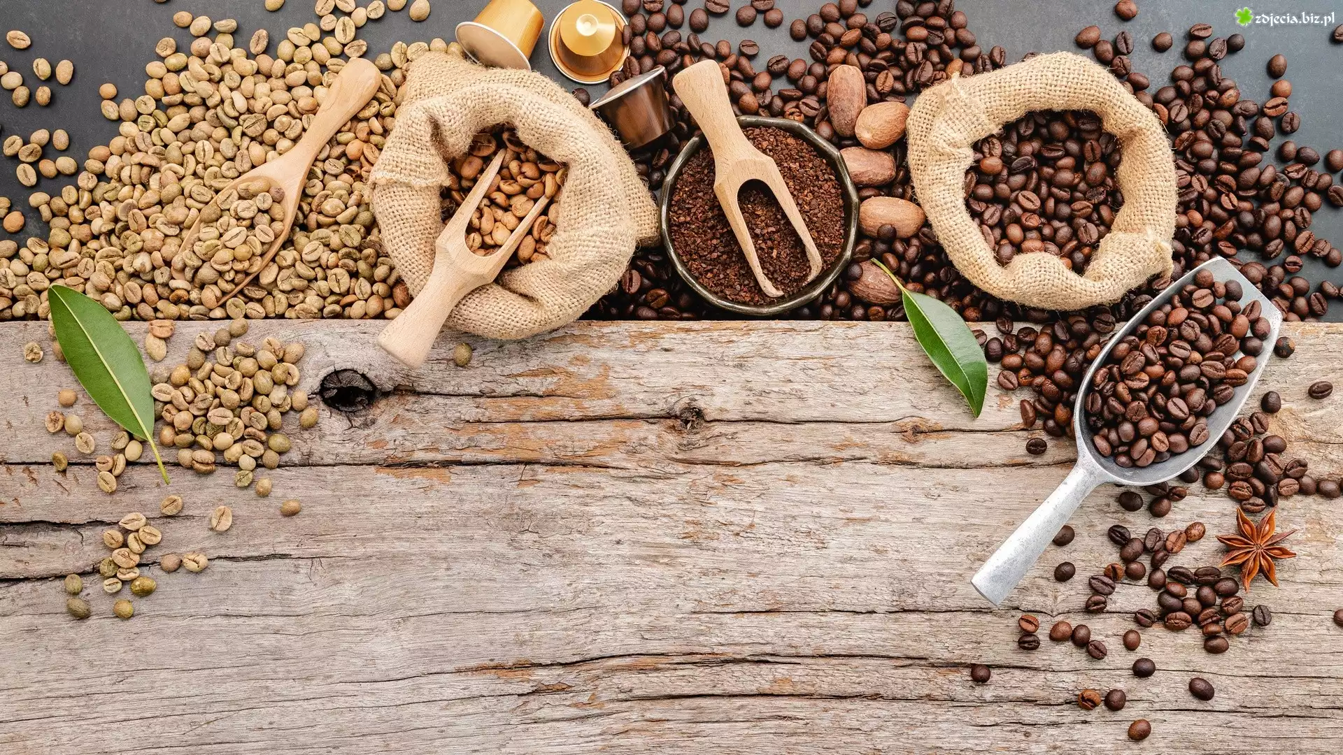 Zdjęcie Kawa, Ziarnista, Worki, Łopatki, Listki