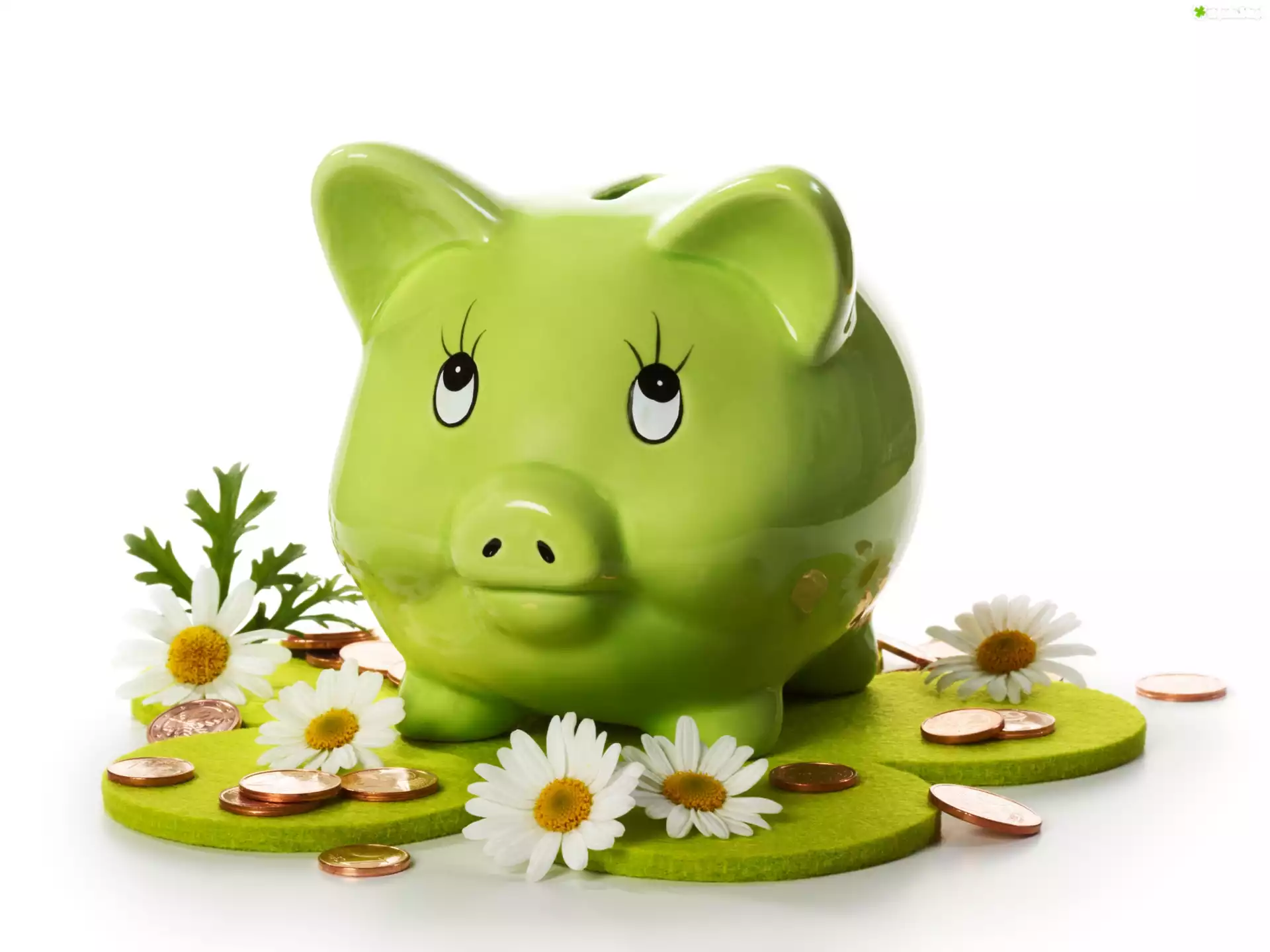 Zdjęcie Zielona, Świnka, Skarbonka, Monety, Margerytki