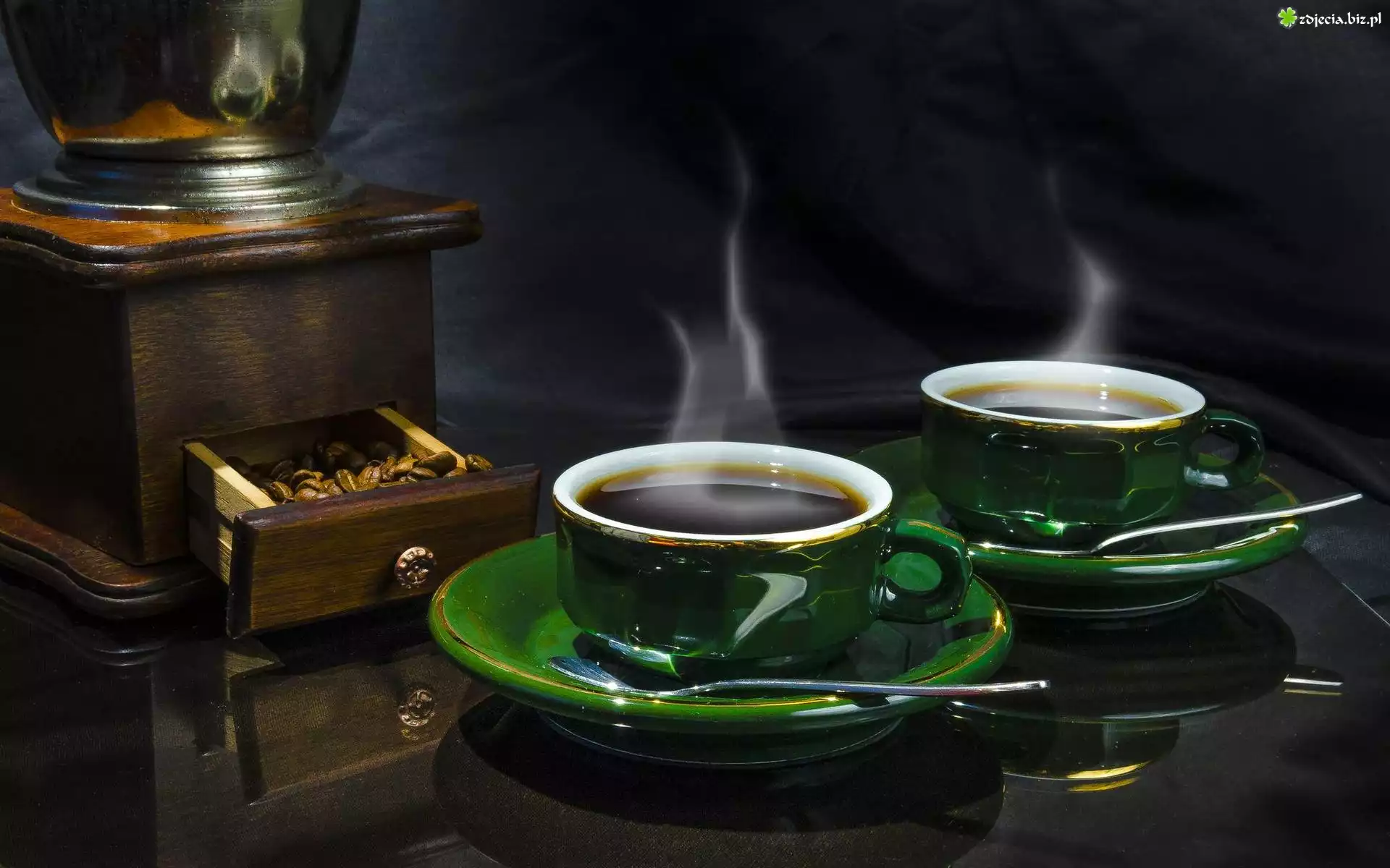 Zdjęcie Dwie, Zielone, Filiżanki, Kawa, Młynek, Czarne, Tło