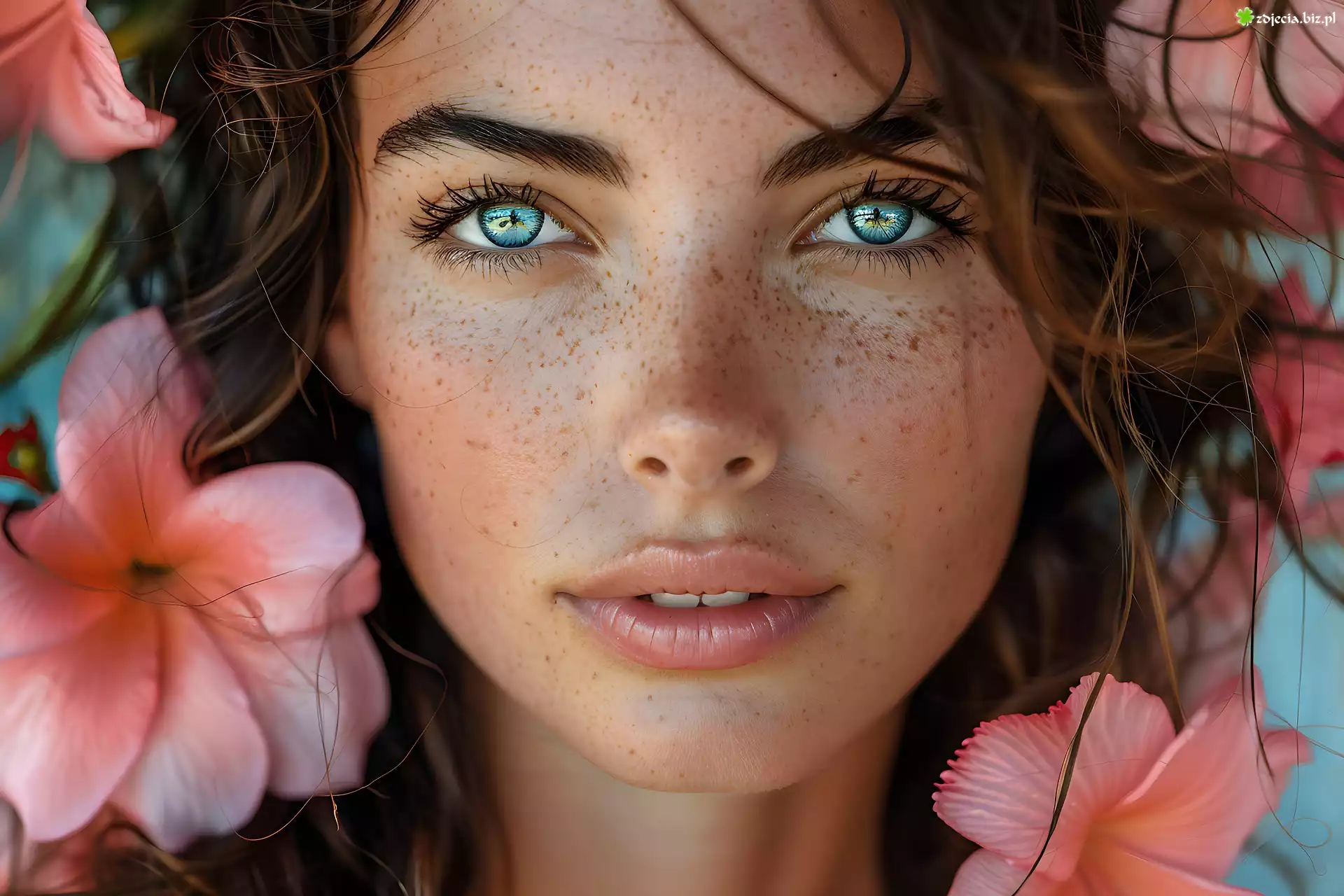 Zdjęcie Dziewczyna, Twarz, Piegi, Zielone, Oczy, Kwiaty
