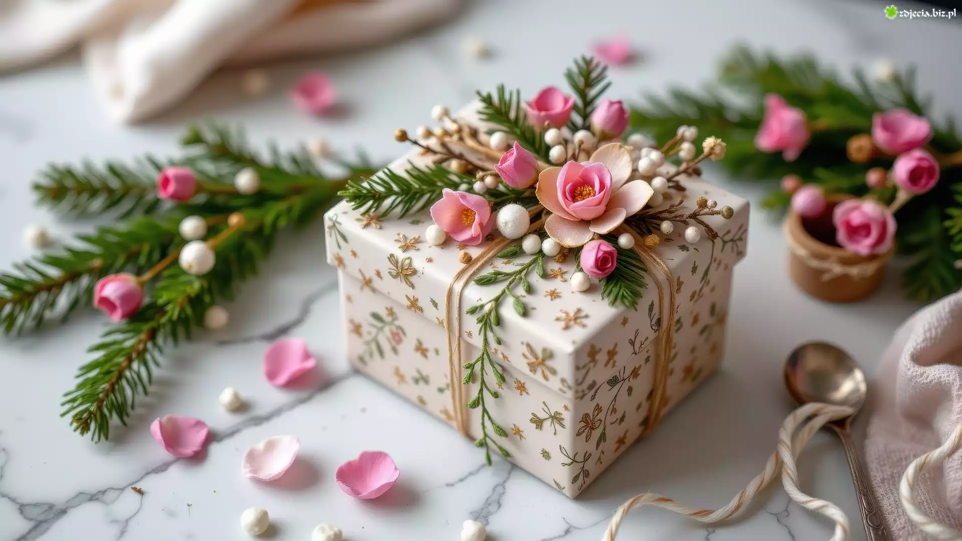 Zdjęcie Prezent, Różowe, Kwiaty, Zielone, Gałązki, Płatki, Kwiatów